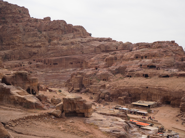 儘管墓室空無,外頭小廣場的遠眺視野倒很令人心醉,正前,是接續要深入的城市後半,有漠色中的主道蜿蜒、岩礫間的點點殘垣、以及際處的連綿嶺巖。將視線轉往左,則可望見方才走過的「劇場」及其背倚山丘,很有可能頂處便是我無緣造訪的「獻祭高地」。