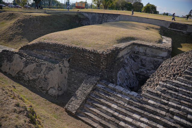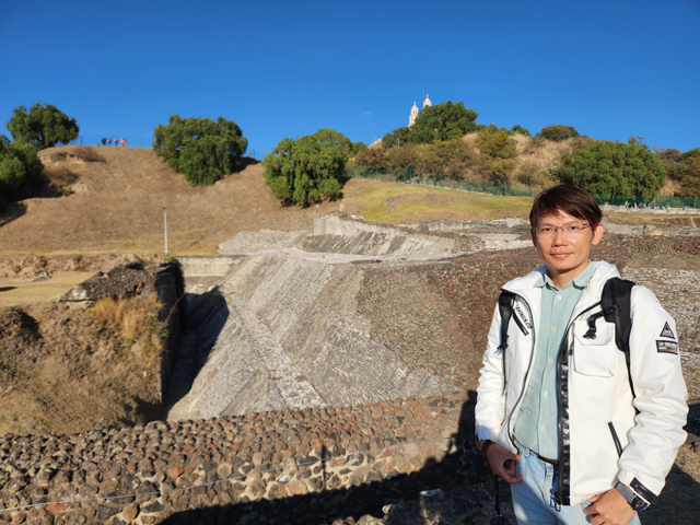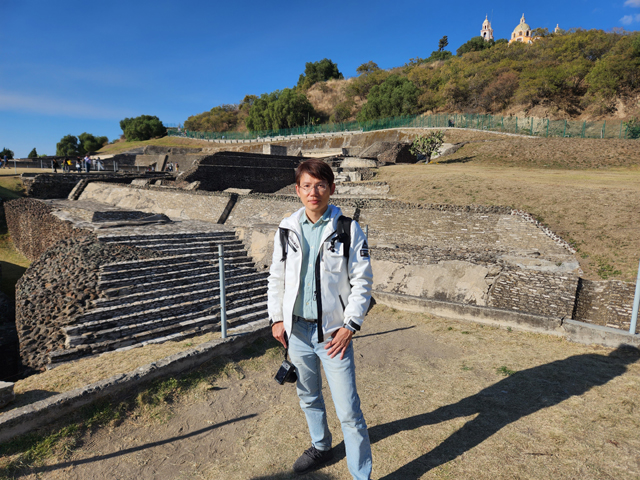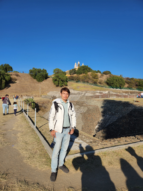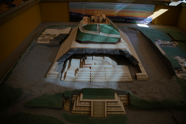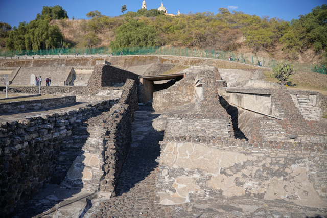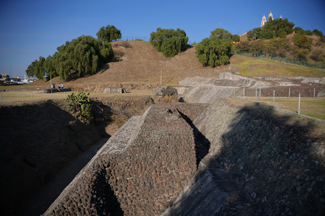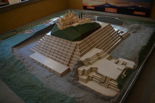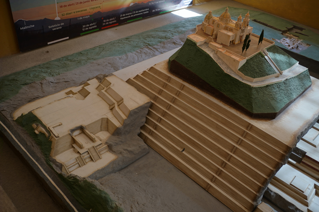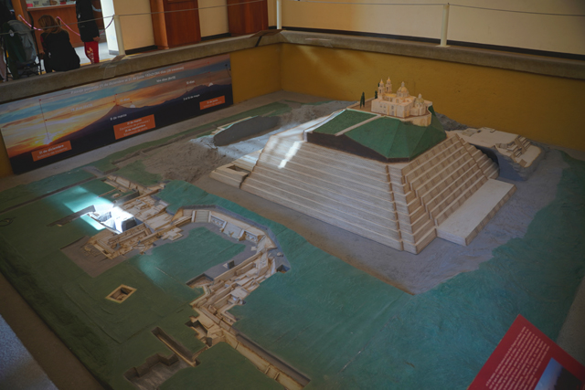 吃飽往「喬魯拉大金字塔」推進,找到在北側的博物館,不知是佛心還是工作人員偷懶,我左看右望都沒見人賣票跟收票。帶著滿腦問號步入,入眼的是個下沉式中庭,放置了整遺跡的模型,可以看到被削頂的金字塔、現在蓋在上頭的教堂、以及塔前被層層剖開的考古區域。據說它底座長寬皆超過了三百公尺,即便目前可視高度僅二十五公尺,若算入被埋的部分,可達六十六,量體仍為世界之最。除了主體,東北角尚有些延伸的層疊,底下埋著最初始的部分,再加上塔前廣場的兩側橫展,雖還未至現場,以那變得迷你的教堂為比例尺,便可推想其巨偉。