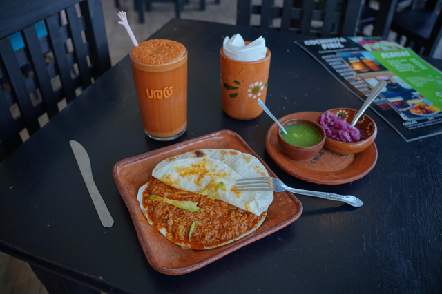 令我驚豔的是飲料,由於翻譯軟體翻完還是火星文,我只好依菜單順位點了「Tascalate」來解渴。結果超好喝,它有點像米漿,卻不知因加了什麼,多了種不在經驗裡的風味。詢問Google,是種來自「恰帕斯 地區的飲品,由玉米、可可粉、肉桂、紅木醬和紅糖製成,有的會再添些龍舌蘭酒,可惜後續幾天的店都沒看到這品項。