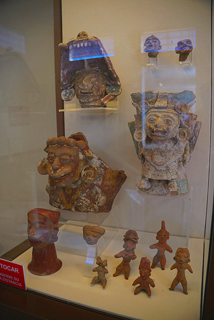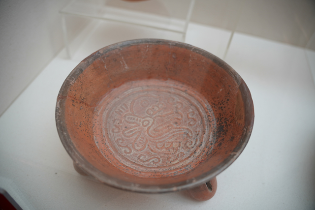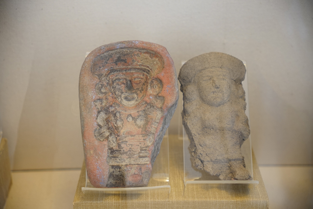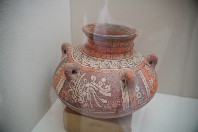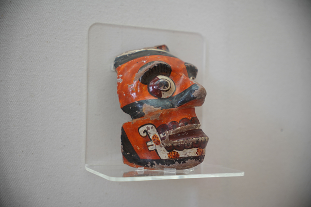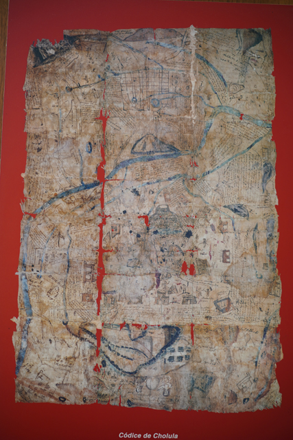 鍋碗瓶罐類的相對較多,之間以年代劃分的解說牌穿插著,推演歷史。公元前的一百年被名為「Proto-Cholula」,當時它還只是潟湖旁的小村莊,器皿在形塑動物之餘,也表達對雨水閃電的敬畏。接續的八百年被切為四階段,因著地理位置的接近,陶器呈現跟「特奧蒂瓦坎」相似的風格。階段二是它最輝煌的年代,大金字塔不斷疊築,神廟廣場遍佈,成了這區域聚落的宗教核心。但就像受了同一詛咒似,當到了公元五百年之後的階段三,它也如「特奧蒂瓦坎」開始衰微,可能是因強降雨,也可能為火山爆發所致,而呈現在器皿的,是產量跟品質的下降。