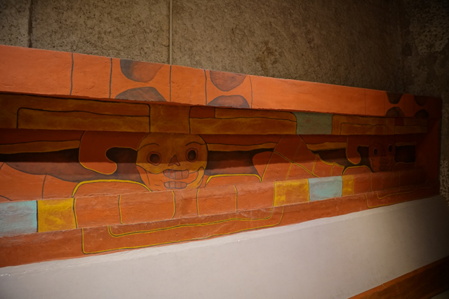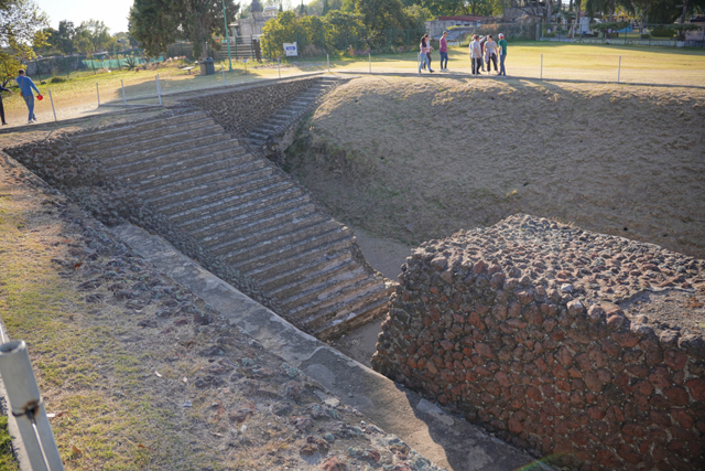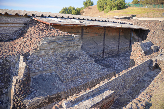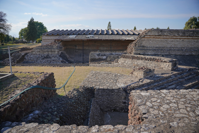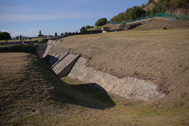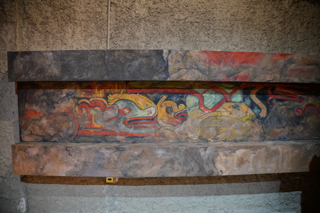 由於丘頂教堂的存在,想還原金字塔顯然不可能,挖掘隧道之餘,被大幅剖開的僅南緣外圍。東南角被標為「建築五」,它因埋得淺,平台東側已幾乎無存,只剩南側斜坡跟一小段階梯。其隔壁鄰居「特奧蒂瓦坎建築」就有比較複雜的綻露,不僅朝南延伸了好一段距離,裏頭構體也曲曲折折。之所以如此命名滿容易猜,因著平台顯現的「Talud-Tablero」結構,由於只能在攔繩外看,到底包納了多少棟其實不太清楚。我能見到的僅近處一座,且還是剖了又剖的部分。解說板提及的羽蛇壁畫,紅綠黃藍,完全沒看到。