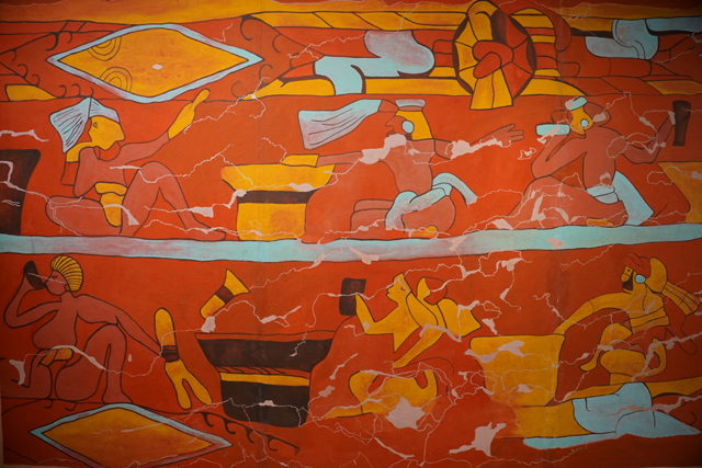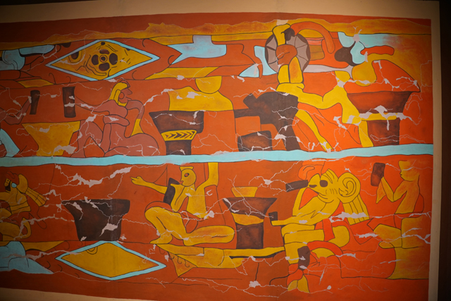 較知名的「飲酒者」相對好懂,能見兩排人持杯坐飲,像處於一場宴席,且應已酒酣耳熱,姿態有點放蕩,甚至還有嘔吐跟失禁。根據標牌,被埋在地底的原畫長度可是超過五十公尺,頗為驚人。不過文字所提的精美頭飾就難感覺了,現場可見就是簡單纏巾外加一條腰布,背景則選擇了抽象,以一些難明線條表達宮殿的華美。若真要比較,同時代的馬雅還是大大勝出,人物神態擬真,衣裝浮誇,就算填以抽象元素也更為細緻。