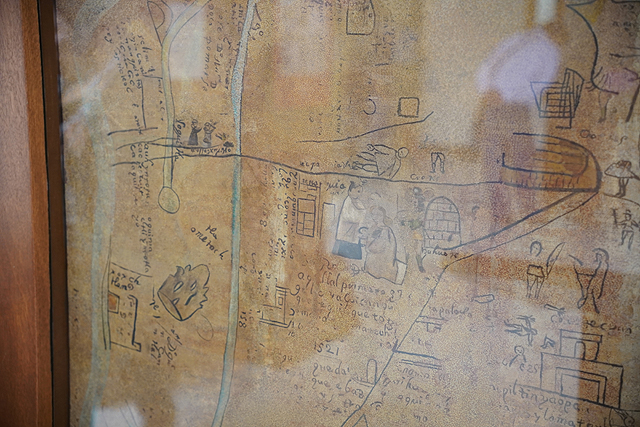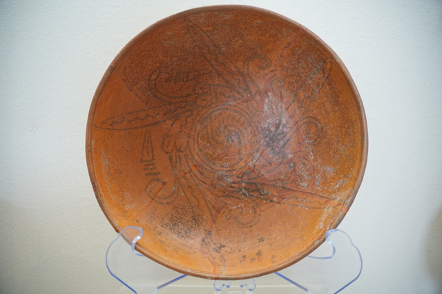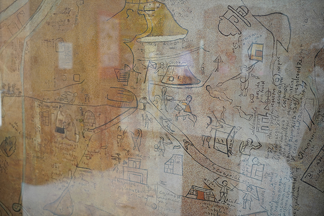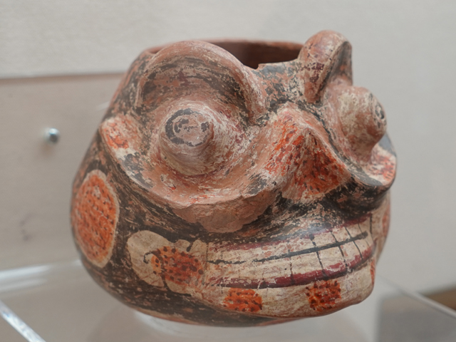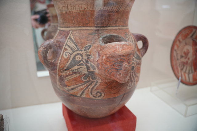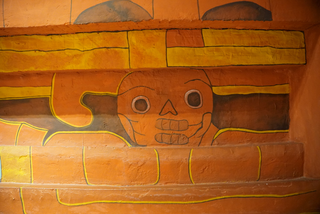當然以我這外行眼是很難看出什麼差異,尤其器皿們並沒有各自的標牌,注意力很快便被壁畫復原區吸去。它們以橙黃棕赭塗抹,筆觸樸拙隨興,若非知曉來由,應該會覺得是小朋友的塗鴉。像其中一幅有著露齒人臉,說是骷髏頭也顯然不夠驚悚,結果答案居然是「蚱蜢」,逼人將那些延伸的彎勾解釋為觸角跟腳。