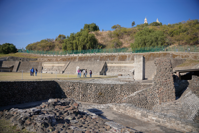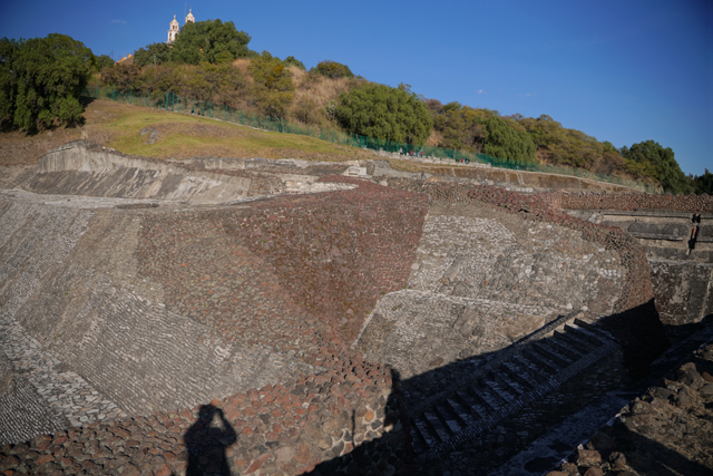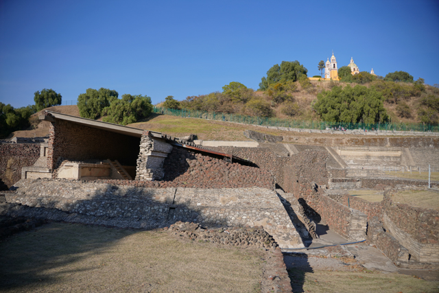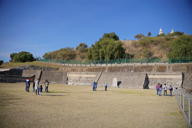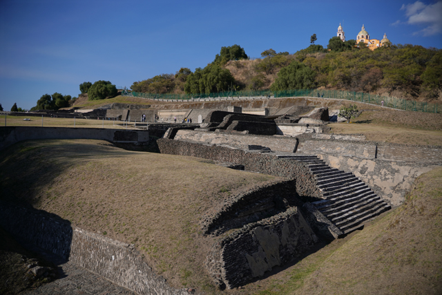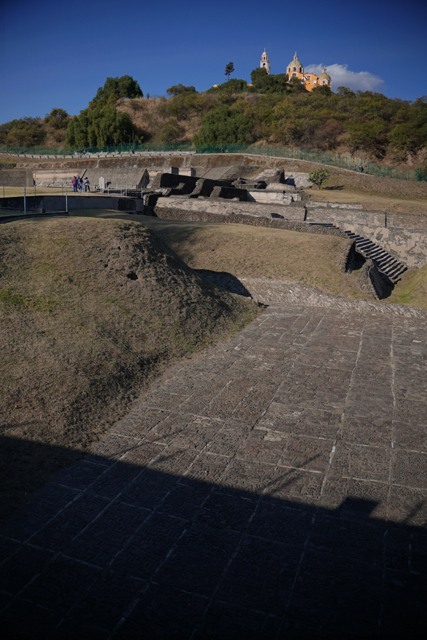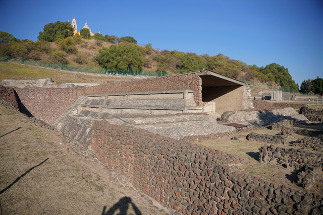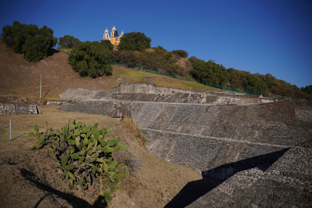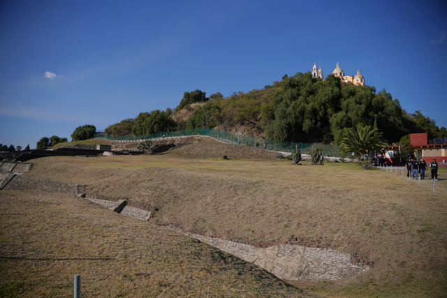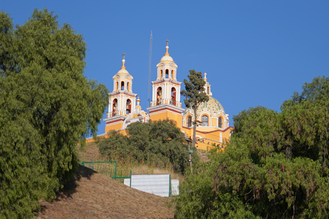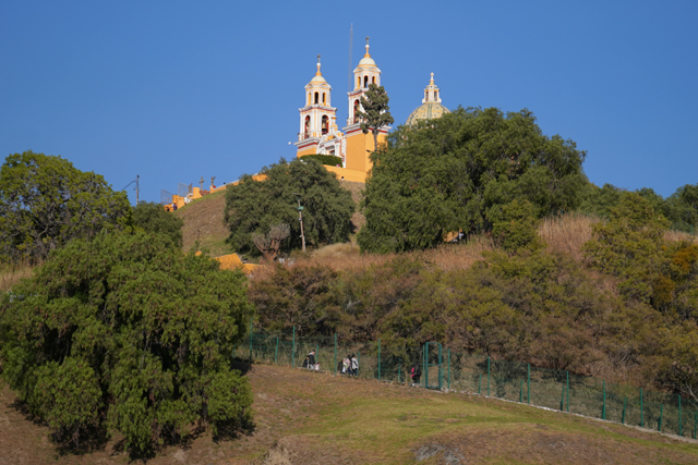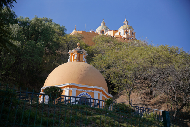 沿路拐往東,我抬頭望著已被林樹侵占的金字塔,若非知曉此地歷史,應該看不出它曾是座擁有切削輪廓的龐大階台吧。丘上粉橘刷色的教堂相對吸睛,中央帽冠、尾堂在藍天勾烙波弧稜線,半山腰有座圓頂小堂接棒,它在地圖被標為「El Pocito de los Remedios」,似乎藏了個可許願的水井。這兒也闢了通往教堂的步道,滿多人略過遺跡直接上山。