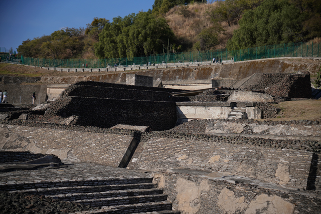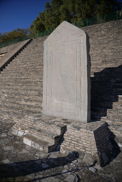 朝最裡處走去,那兒有階路築於正向與兩角,可惜被往教堂的環丘步道切斷了,接續便是攀生林樹,究竟是否曾上劃到頂頭堂殿,是否曾有祭司在隆重鼓擊中緩步登階,就成了個謎。能多加端詳的只剩梯與梯間的坡面,那兒有基於「Talud-Tablero」發展出的裝飾風格,階狀的紋路很像一個個「凸」。