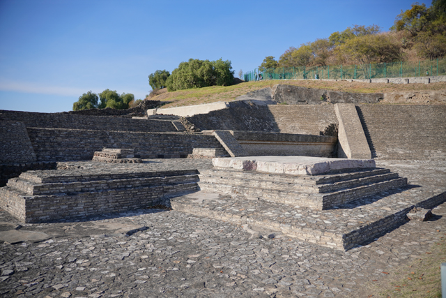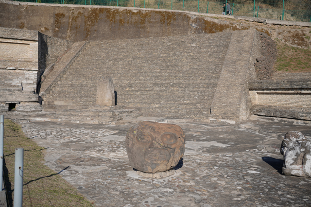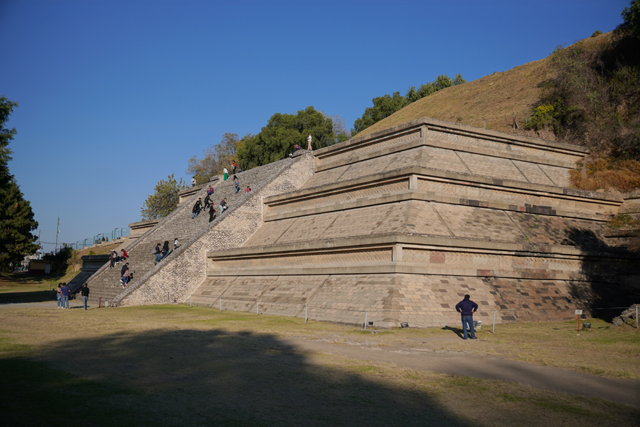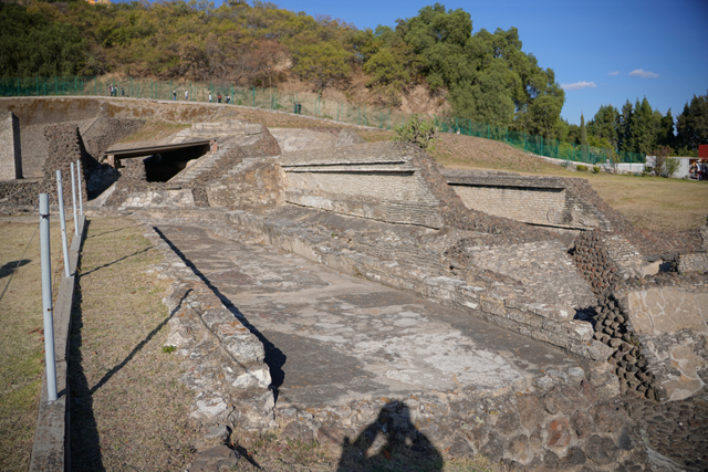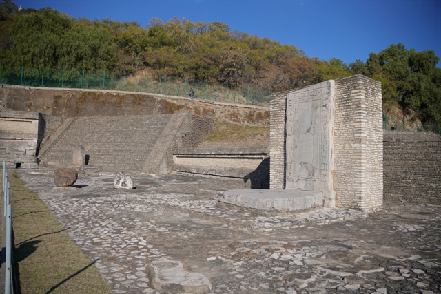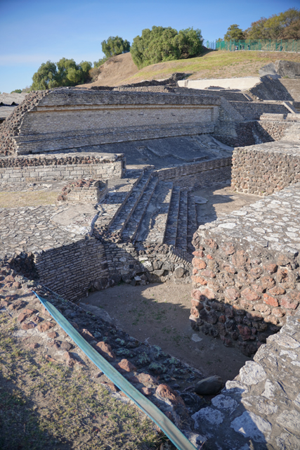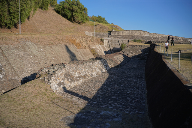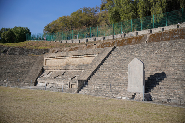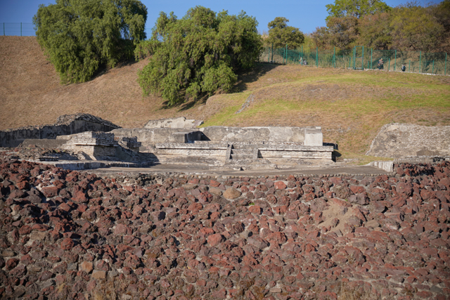 腦袋的胡思亂想沒持續太久,畢竟他是有同伴在的,笑笑揮別後,依舊得收攝心思,繼續遺跡的繞行。「特奧蒂瓦坎建築」朝南延伸的部分被稱為「石板庭院」,因著地上的細碎平整舖面,斜坡還有以石條斜向拼組的,有種會往馬賽克裝飾發展的意味。由於呈長形,兩側又有斜坡,不免讓人瞎猜會否也曾是個球場。但說明板沒提就表示只是種狂想,而根據上頭文字,它屬於「建築六」,不僅曾覆蓋了前兩區,還橫展了三百公尺,成了整金字塔的南緣。