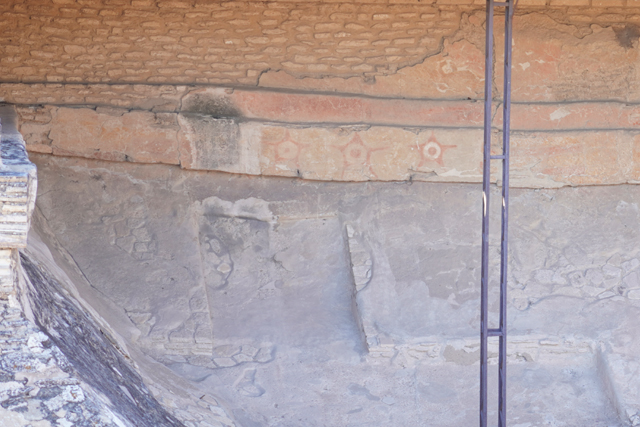 轉到庭院西側,這邊的碑板雖已遺佚,其後方的「建築三」狀況卻挺不錯,考古人員往內挖去,居然還找到壁繪,知名的「飲酒者」真跡便是在此。努力朝被浪板保護的區域盯瞧,可惜真的太遠了,過烈陽光造成的明暗差也增添難度,即便用相機拉近捕捉再狂加曝光,只不過看到些紅色五角星,或許人形部分藏在隧道裡吧?無緣得見壁繪,便僅能將視線挪回建築殘礎,其形貌挺有看頭,折轉中穿插著斜角,某些地方可能為想找到階底,挖得相當深,若加以擴延,應該就會變成個3D迷宮。