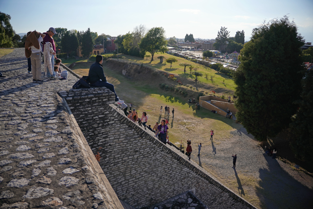 爬了上去,台頂已有不少遊客或好奇走探、或迎風坐望,景緻倒沒期待中的遼遠,就是多納入了城心房閣,由幾簇林樹跟教堂鐘塔勾出的天際線。照方位,那兒便是「Cholulteca」時期,由「Tolteca-Chichimeca」人經營的區域,即大屠殺所在地。然如今「大天使加百列修道院」與「協和廣場」將其替上迥異風情,近處廣地也被熱鬧市集和遊樂設施佔據。這兒的人還記得曾無辜喪命的祖先嗎?還是那些血腥的、憤怨的都早淡化在民族混融與四季更迭裡。