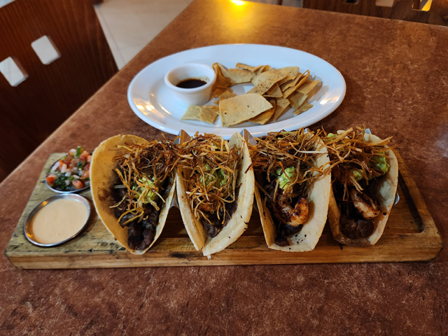 不敢上街覓食,走去旅館自營的餐廳,這也是我挑這家的原因。詭異的是,完全沒客人啊,該不會超難吃?盯了菜單好一陣,作好心理準備,選了蝦牛雙拼的taco,怎料它上桌時竟有經過妝點的擺盤,叉起餡料送入口,味道也不錯,可能門可羅雀只因快收攤了吧。不過這樣的好評第二晚就翻車了,本是對這最終一餐滿懷期待,結果送來的麵包夾沙朗牛,肉無敵硬,我咬了半天最後還是幾乎吐出來,超生氣。