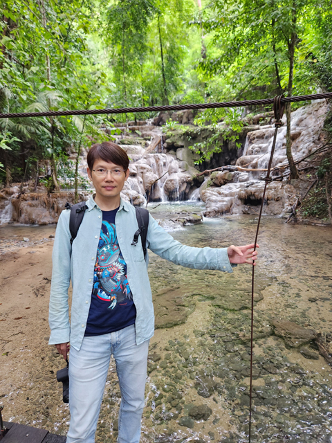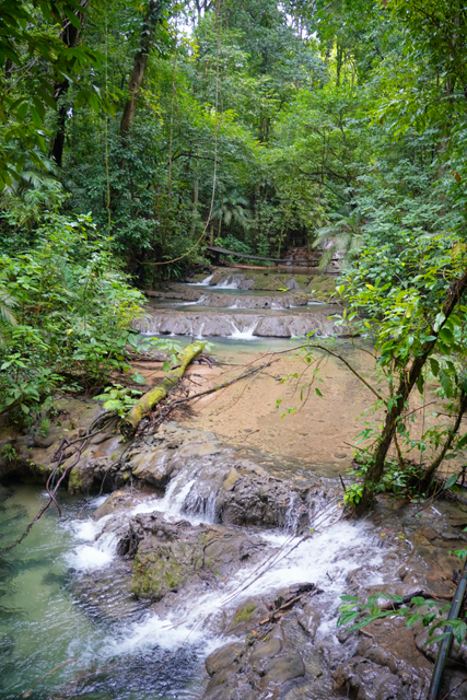 即便出乎預想,愣了幾秒覺得沒差,就跟司機掰掰了。這端進去得先穿過叢林,曾看過文章寫此區比較蠻荒,某些地段必須踏水,可能資金有撥到這了吧,沿途步道階梯已經過整理,走來滿安心。一段步程後還冒出了小吊橋,不僅助人橫越潺潺溪流,還成了賞景地,能看瀑布層層落降,雖算不上磅礡也未高懸,在林色掩映間卻顯得清秀可人。