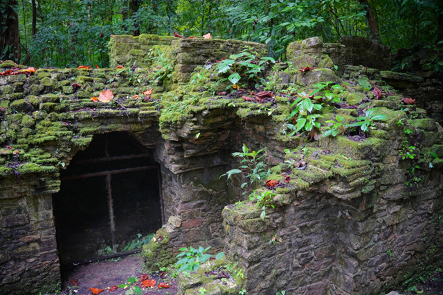 由於是逆向,一路幾乎沒啥遊客,只有幾個不知幾點就來的跟我錯身。這也讓走在林中相當幽靜,尤其當見到第一個小遺跡時,不禁雙眼發亮,苔染的殘頹,尚未經太多的重修,很有那種在叢林乍見遺跡的感動。我努力拍著照片,可惜技術不到家,調不出還原現場光影彩度的設定。當時林中微暗,頂頭陽光將部分葉色映得透亮,配上紛落的紅葉,便輕易辟去塵世煩擾。我不禁就在這賞望許久,看頹牆的淒傷、大自然的輕柔撫觸,開心自己有排除萬難過來。