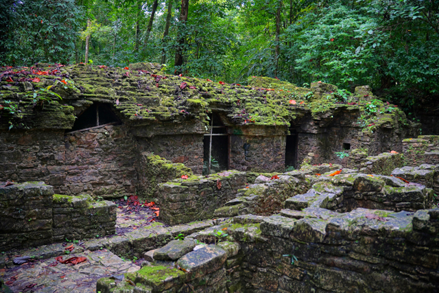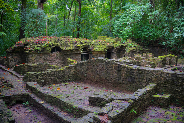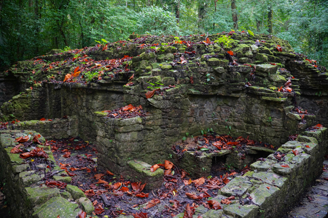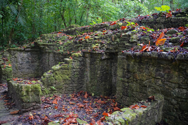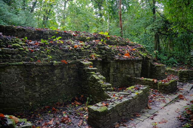 順著步道往前,裏頭有區更大的「Group B」,一對男女不知是剛來還是已逛完,就這麼於階頂坐望閒聊,不願離去。無從知曉原本的佈局,廣場周邊零散著小階台,民宅高低穿插,當中還藏了儀式用的蒸氣浴室。它們雖少了紅葉綴點,沒前一區幻美,綠意的色階流轉仍舊引人。某些視角尚有斷樹增添構圖變化,乍看像應和著免不了的散滅,分生的枝苗又推轉了輪迴,與殘屋攜手轉生。