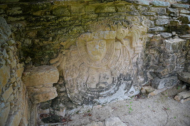 如此小小奮鬥了一陣,設有廁所的休息站在階頂給出了預示,而當稍稍喘氣解放,再幾步前邁,便終於望見期待中的城都核心。在這邊打頭陣的被稱為「North Group」,併排神廟像五兄弟一般,高築於階台。最東一棟小的已經消失,居中被還原的據說模樣跟它一樣。東二是狀況最好的,不僅柱牆,連屋頂都算完整,其主階旁的台壁被草簷遮覆,好奇走近,還真留有一人形浮雕,層層項鍊掛垂,圈圈眼暗示該與雨神「Tlaloc」有關。以此擴延,當初整壁面都該有著如此飾綴。