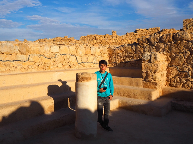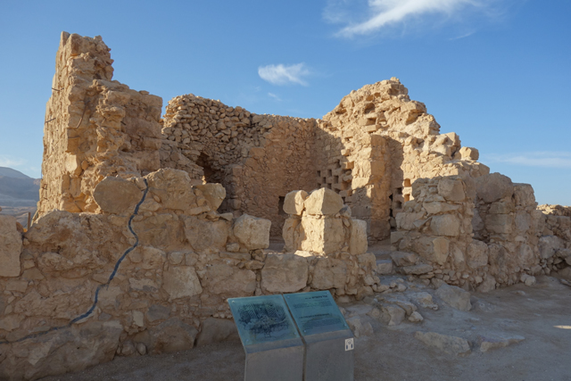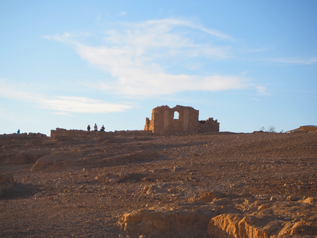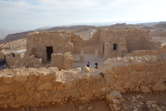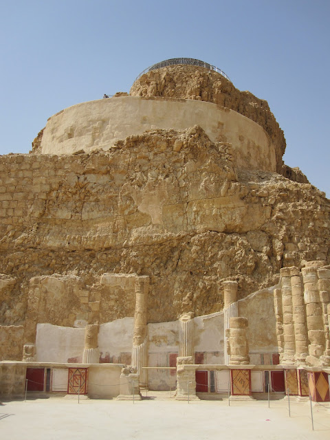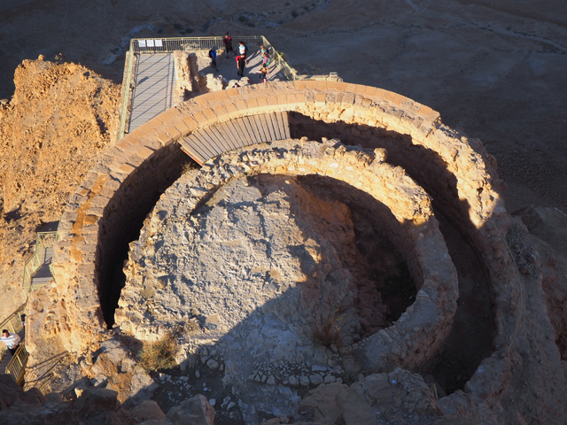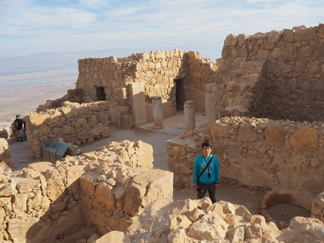 「希律王」當年雖接管了猶太人的土地,仍隨時擔憂會被推翻,再加上南方有知名的「埃及豔后」虎視眈眈,便在諸多地形險要處蓋了堡壘,「馬薩大」應是他極為滿意的一座,以離宮規格加工,大有想在此終老之勢。他先於遠離入口的台地西邊蓋了一區,但可能覺得視野不夠好,又在北側建了規模更大的。導遊帶著我們往那走,宮區外除了另一重已經坍塌的環牆,還有座塔樓標的著,宮門旁另有棟房閣戍守,經過考據,應該是得到「希律王」信任的指揮官宅邸。