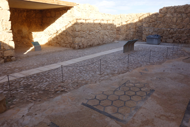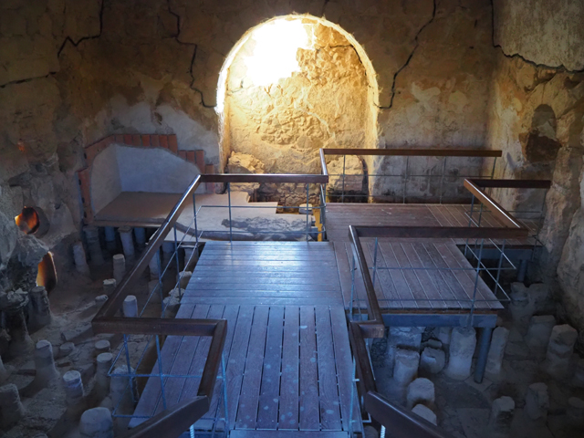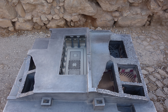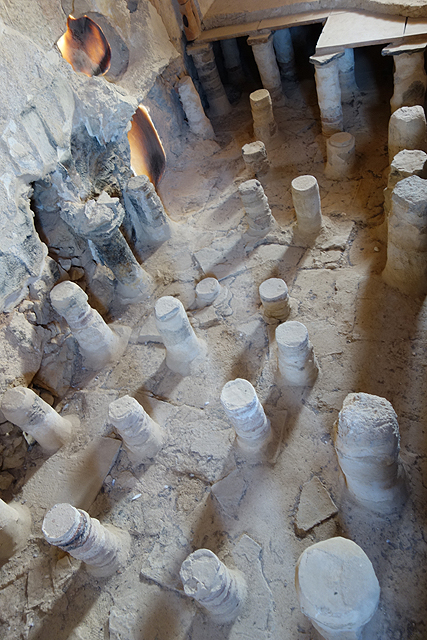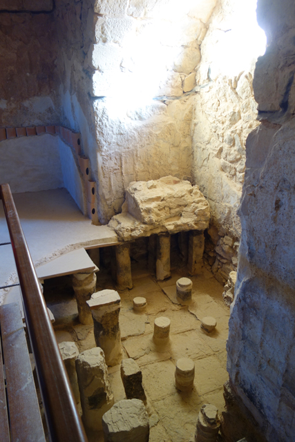 這兒的澡堂與概念裡的不同,皆屬於乾式,幾個簡陋小池是後來反抗軍的添加,用於儀式前的淨身,在「希律王」年代則是利用外頭的鍋爐、壁內的管線來幫房間作調溫。往旁拐,隔壁這間設定是最熱的,由於地磚幾乎皆已破損,剛好揭露了底下結構,原來房底是用小矮柱架空的,隨灌注蒸汽的多寡,便能改變室內溫度。