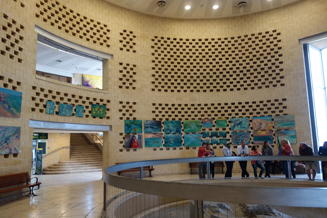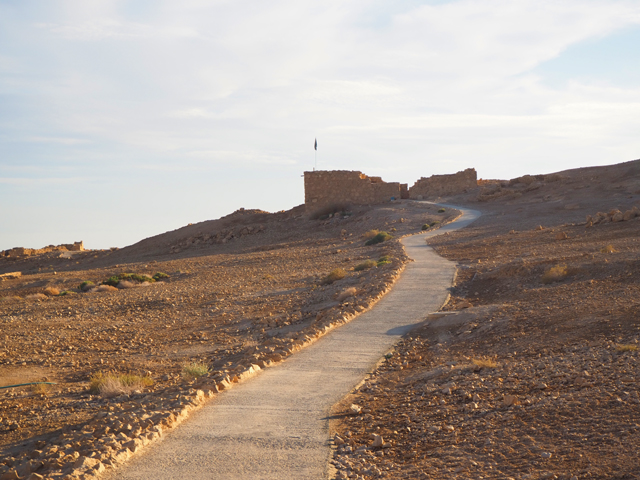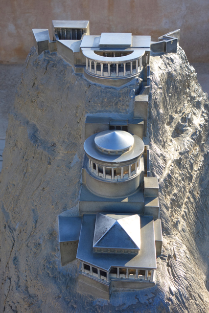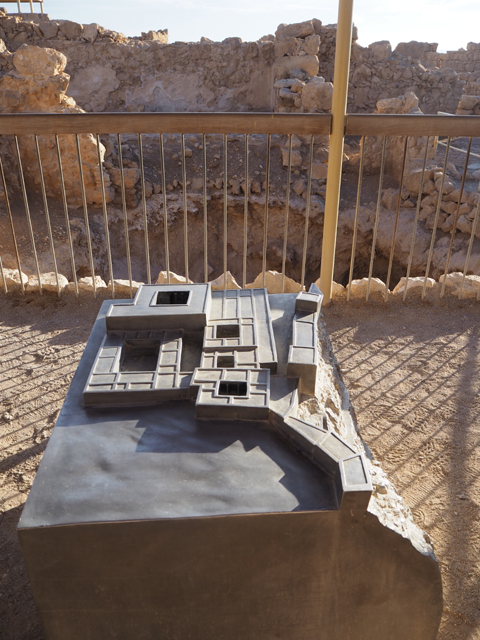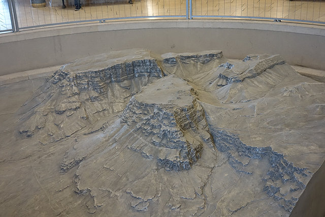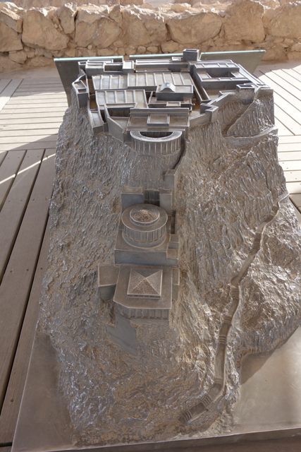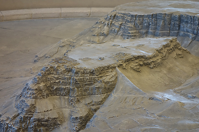 瞎猜了好一陣,終於一座特徵挺符合的山岩冒了出來,但才盯望幾秒,車便已駛進停車場,然後領隊招呼著,將我們帶入遊客中心。這棟建築相當大,可能還綜合了展館與研究部門,中央有個挑高圓廳,廳旁以諸多湛藍海色的掛畫妝點土色壁面。走到心處,那兒置了「馬薩大」所在的山丘模型,可以看到整平的丘頂、綴邊般的防禦環牆、以及從崖壁三階落降,挺鬼斧神工的「希律王」離宮。