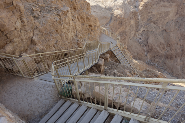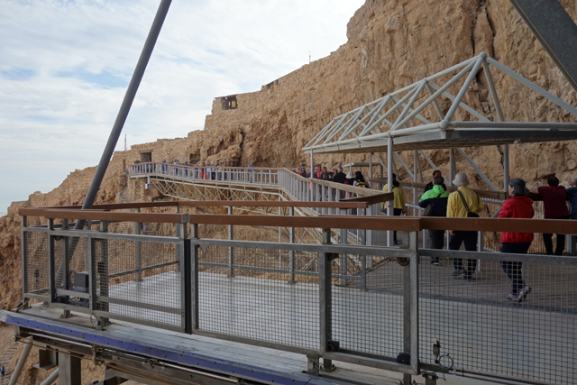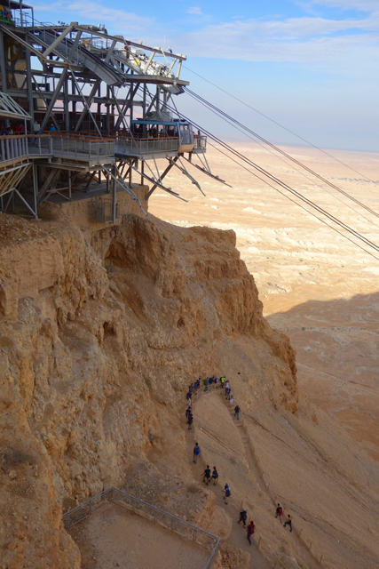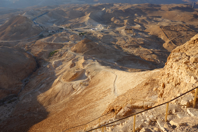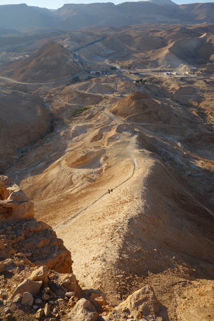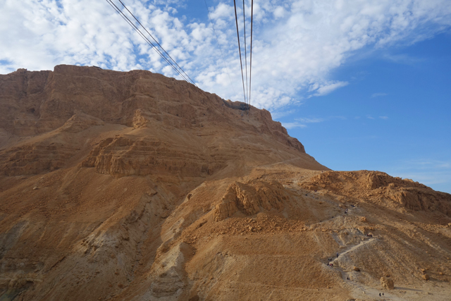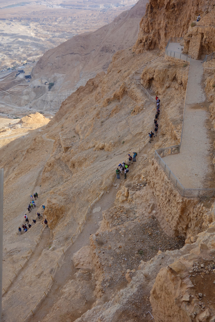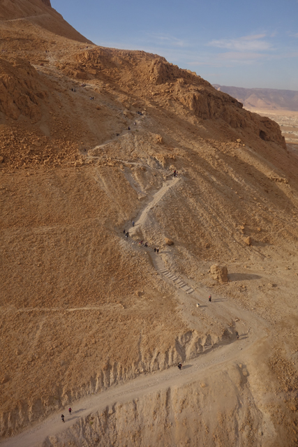 過往要上「馬薩大」,須由東面險峻狹窄的「蛇道」迂迴爬登,沒在運動的城市人多半得花一小時,若在夏天還會被烈日烤得汗流浹背,幸好近年蓋了纜車,觀光客只要肯掏錢,便能舒愜快速飛升。從窗口往外看,遠處仍是一片蒼茫,仰望山頭之餘,不免也朝腳下的「蛇道」看。步道初始還算平緩,努力上爬的朝聖客們組成了一幅蜿蜒風景,漸漸便能感覺其艱難了,坡勢不但轉陡,階面又不平整,有些地方還是崩亂的碎石,一個腳殘很可能就摔成肉泥了吧。