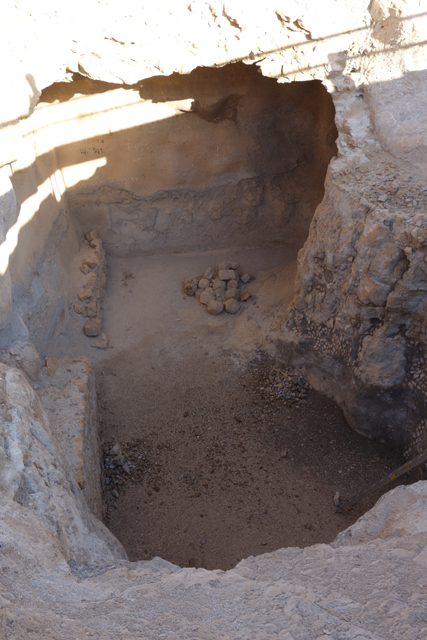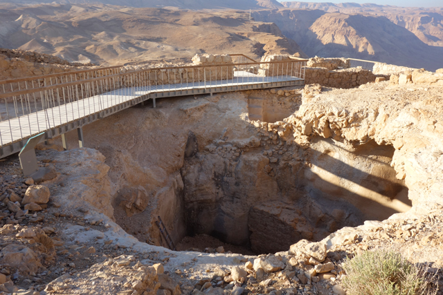 望過當年的行政區,行經宮殿的另個進出口,眼前出現一個深廣的大型蓄水池。類似「昆蘭」那邊的生存思路,「希律王」也在城外築了引水道將雨水導往鑿在山壁的諸多洞穴,然後用人力馱獸將水往上運,據說此類規模的蓄水池在這山頭還有好幾個,足夠「希律王」撐過戰時及平日的奢華揮霍。