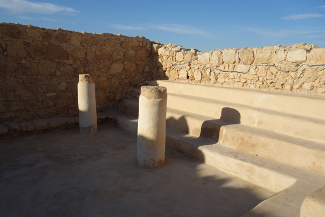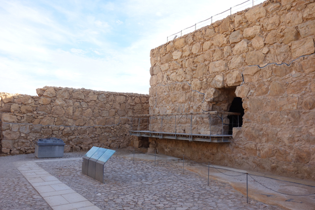再過去,就接上西側的防禦環牆了,這兒的牆體都附有相連廳室,其中一間本該是馬廄,但被反抗軍改建為猶太會堂,兩側有略經修復的立柱與階梯座席,裡處的小室曾用來埋藏收損的經文古卷。隔鄰的物事則比較雜,除了反抗軍的生活用品,也有羅馬軍所屬,估計是曾將搜刮之物集中在此作挑選。