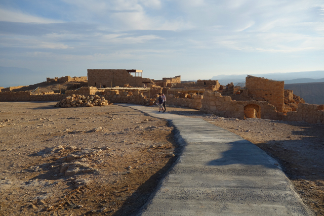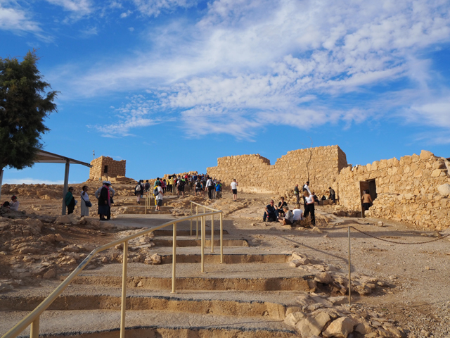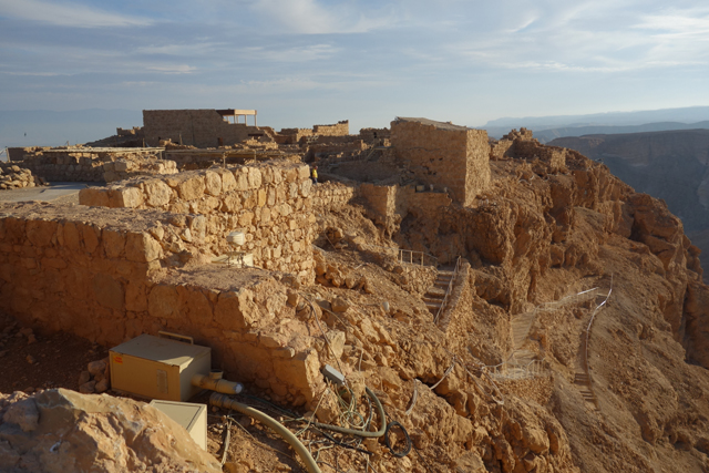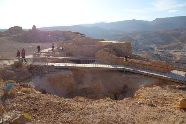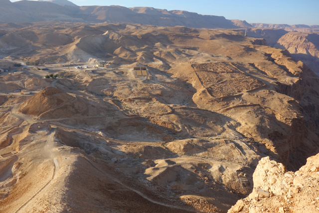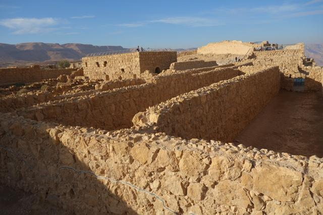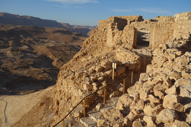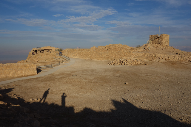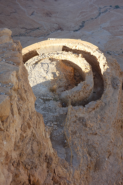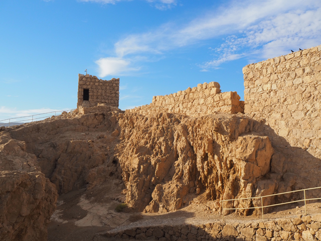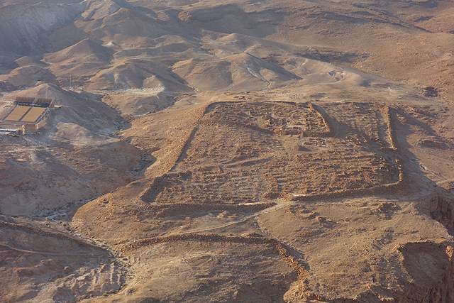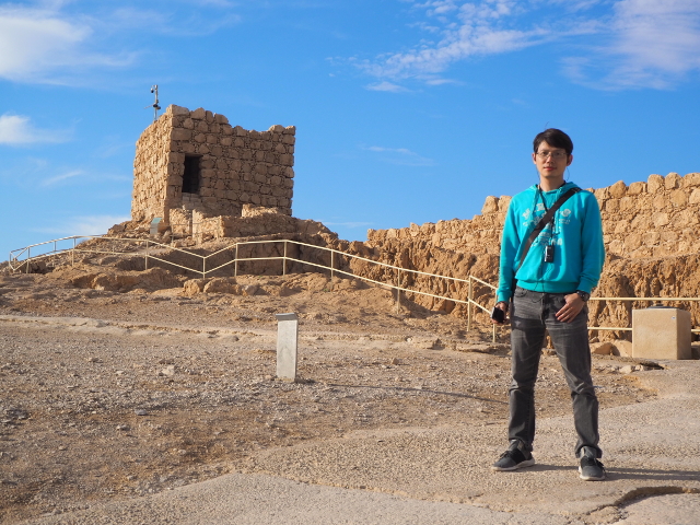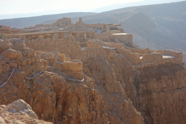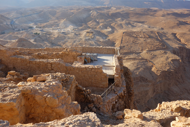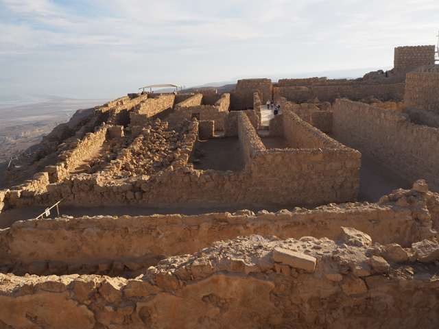 由此處的城牆缺隙往外望,底部丘坡有幾個以土堤堆疊的大方陣,中間殘礫起起伏伏像曾有什麼建物,那便是「羅馬十軍團」曾經的駐紮處了。雖對其能存留至今感到訝異,但祕魯那宛如外星人圖繪的「納斯卡線」都能撐過兩千年了,同樣身處荒漠的此陣應也可以。當年中低階層的猶太人由於不堪羅馬總督的壓榨剝削及祭司群的同流合汙,在「奮銳黨」的帶領下殺了不少貴族,佔領「耶路薩冷」,還闖進聖殿把借據燒個精光。於是震怒的羅馬皇帝派出驍勇善戰的「十軍團」以武力鎮壓,順帶徹底摧毀了聖殿,根據記載,死於鎮壓的猶太人多達百萬,起義軍節節敗退,最後剩不到千人退守至「馬薩大」。