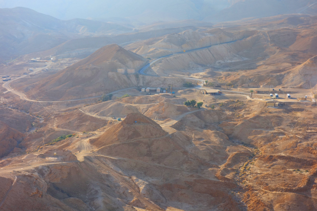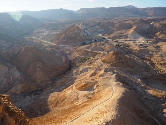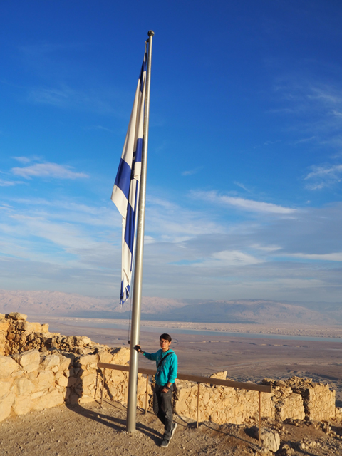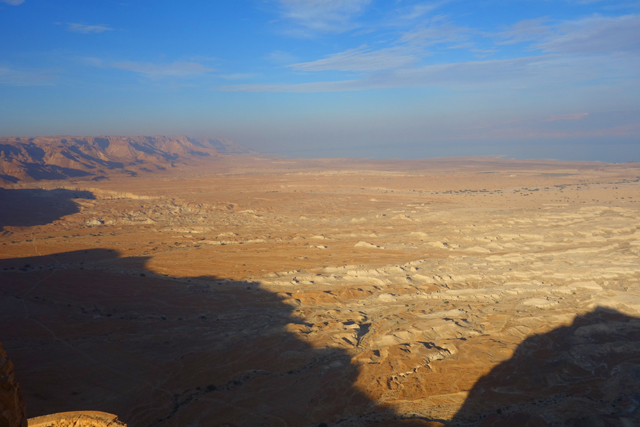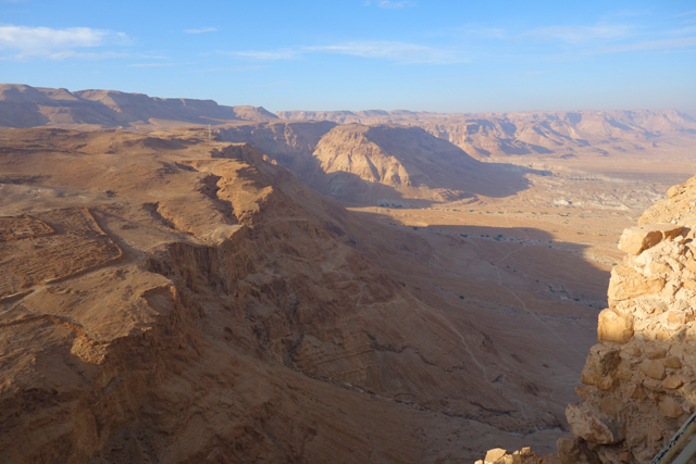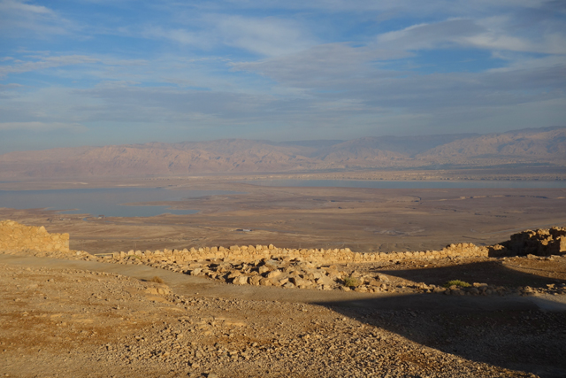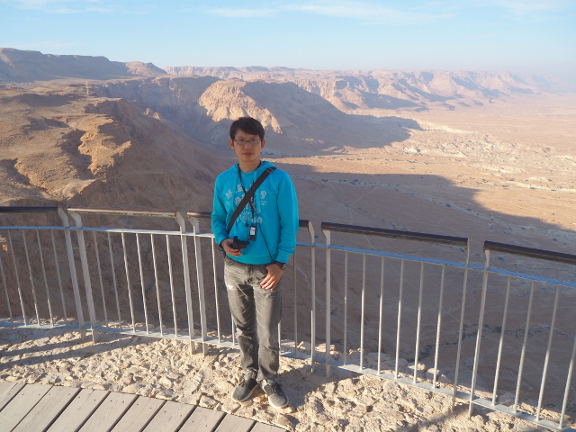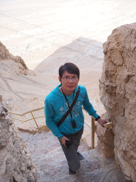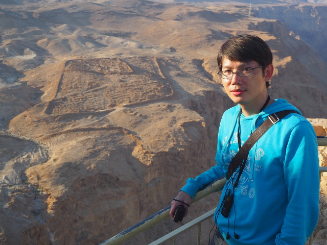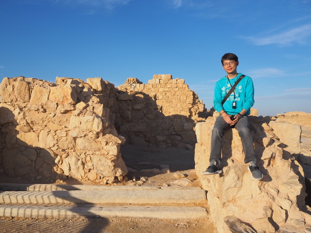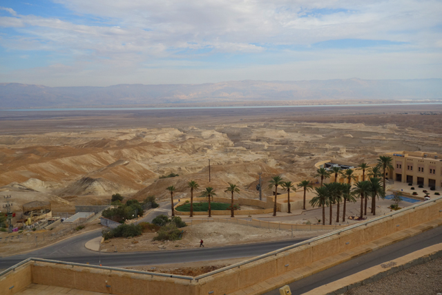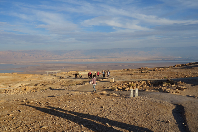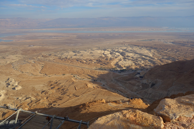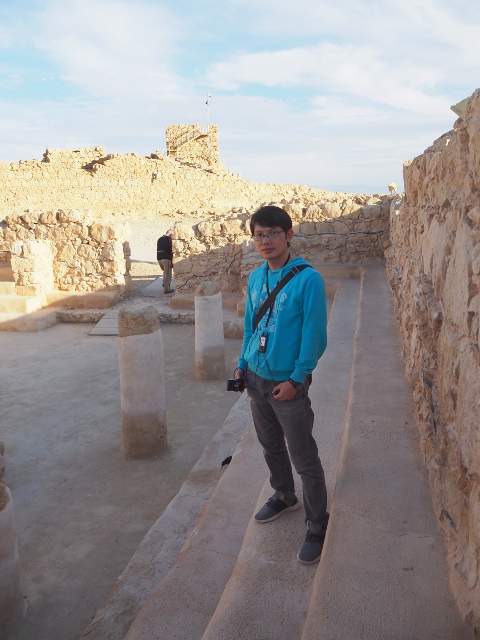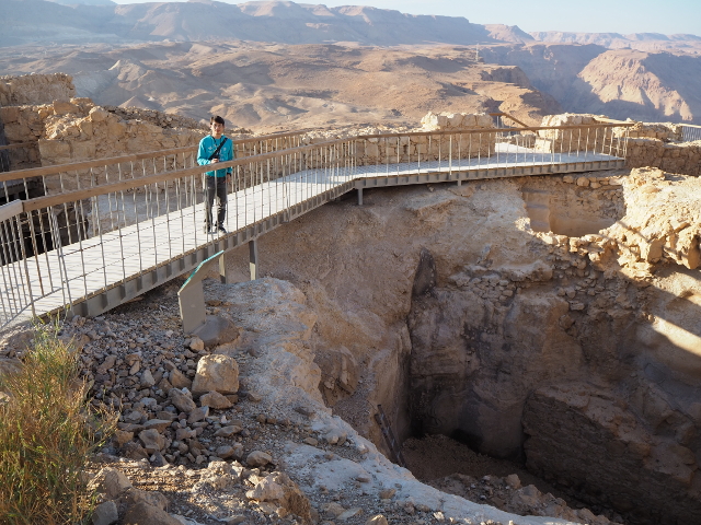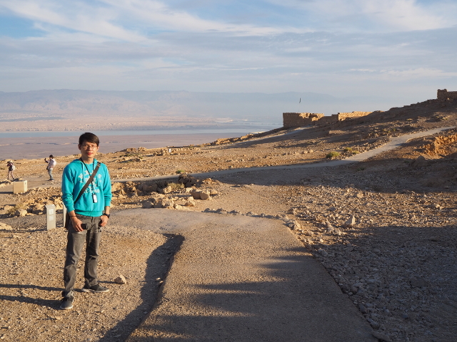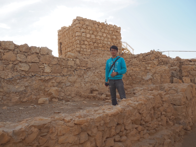 逛了一圈出來,我們爬上北端高台,原本此區應是「希律王」的寢宮,但不知這些年歷經了什麼,沒見多少隔間殘存,除了背牆,只遺下半圓形的陽台,成為遊客環望周邊的休憩點。走到欄杆旁,即便今日的天空有些灰茫,仍可理解為何「希律王」要將主宮遷移過來,這兒的視野遼闊,東邊有死海的淡藍水色往天際延伸,西邊則納入了嶔崎疊層的重巒,根據說明板,當把目光往北拋,還能見到這片曠野的難得綠地「隱基底」(En Gedi)。