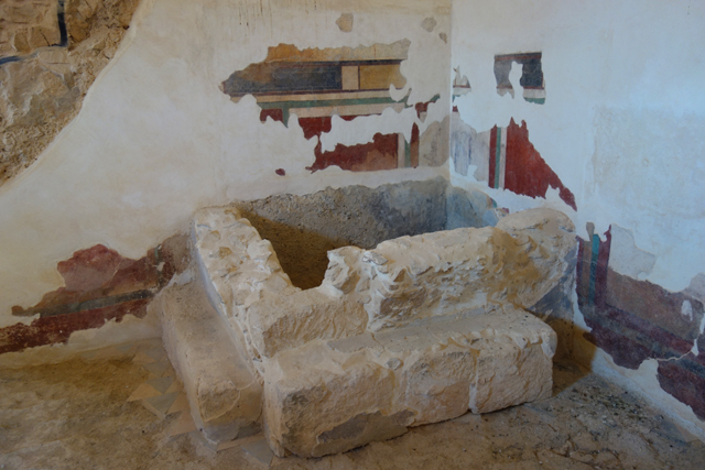 倉庫目前所遺留的就是幾道顯明長牆,導遊沒打算花時間在它上面,直接把我們帶往「希律王」的澡堂。澡堂是羅馬時代的重要文化,可聊天可商談大事,彼此都赤裸著也不用怕被暗殺。根據堂內的模型,一進去原是個迴廊中庭,不過目前只是塊略經整理的空地,當中的六角地磚應該是當年的殘餘。再往屋裡走,更衣間後有暖室及冷室,牆上很難得遺留了些許色彩,為赭紅、靛藍、土黃相組的飾框,這樣的風格很讓我聯想起早年於「龐貝」遺址所見,羅馬的影響力實在無遠弗屆啊。