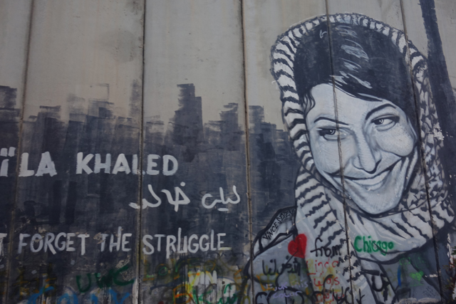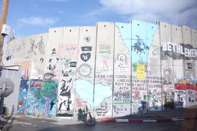 以色列在交界之處立起高高的圍牆,一來為了國安,二來也有種威壓式的孤立,不打你,但我把你關起來,對外通路由我管,看你能怎樣。原以為進出關會有嚴密的檢查,重裝士兵上車檢查之類的,結果什麼都沒有,車子不用減速,直接就從牆門駛過去了,是真的比較和平了嗎?還是每天去「伯利恆」朝聖的觀光客太多,遊覽車就像持了御賜金牌一樣,可以隨意直闖?我在瞎猜中四望著,「巴勒斯坦」端的牆面被繪滿塗鴉,五彩間有不少借用神名的嘲諷,感覺皆在表達這種「類囚犯」的不爽。