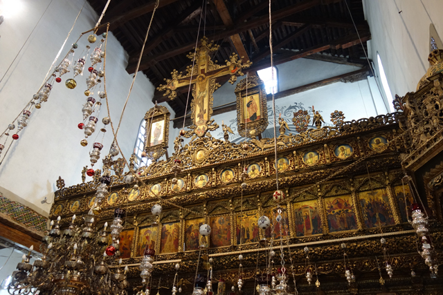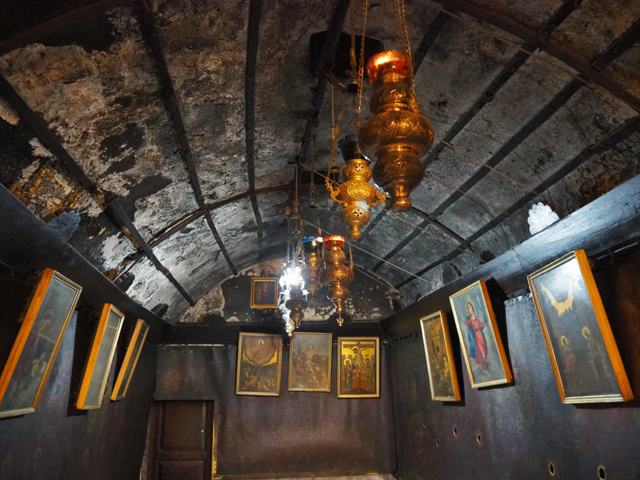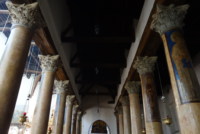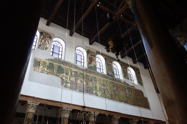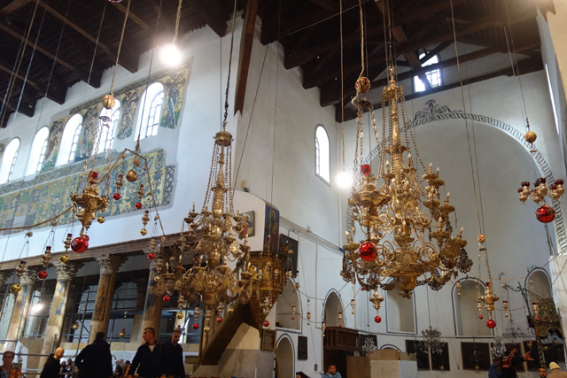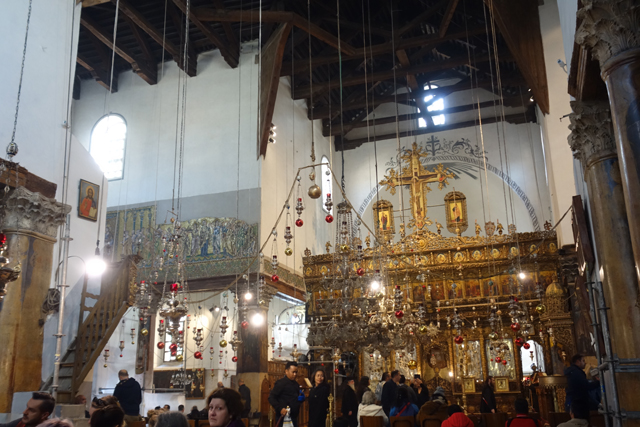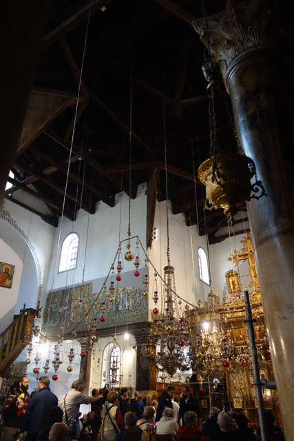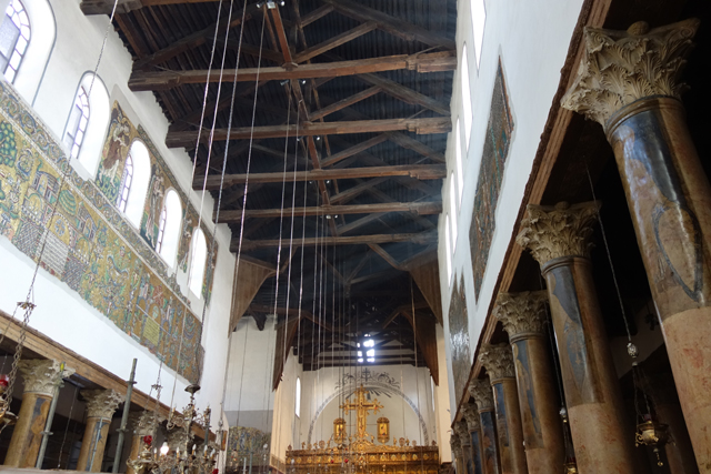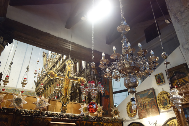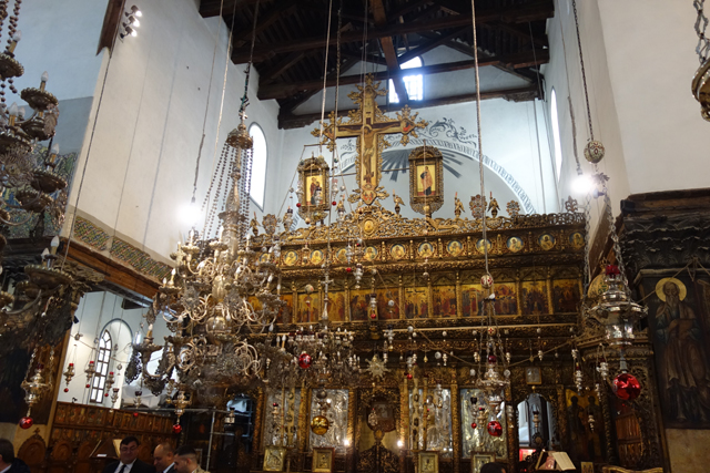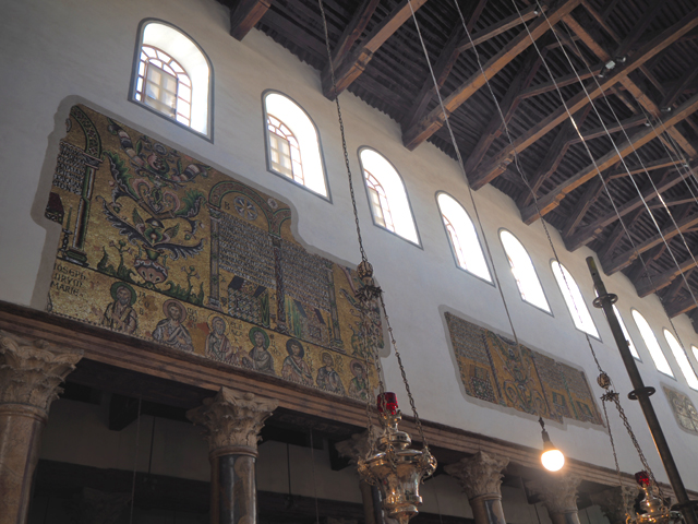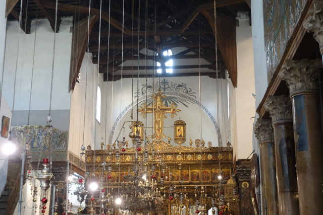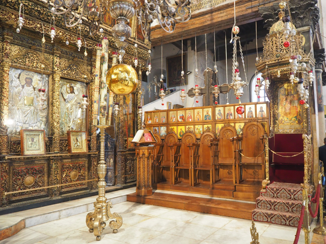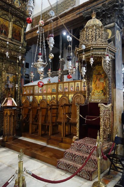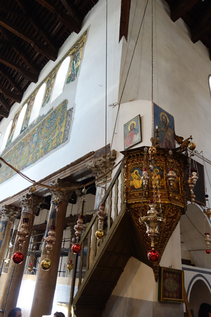 主祭壇的妝點自然不僅於此,如花繁綻的吊燈居中劃掠,無數油燈隨其高低垂落,旁側還雜了彩球斑燭,讓人惑亂了眼。除了後方高處的講道壇,疑似設予主教的座席也是亮點,於側板跟冠蓋展現了複雜雕工。無法得知是吹噓還是經過認真考據比較,這棟「主誕堂」被稱為最古老的教堂,儘管最初殿心的八角結構已經不在了,與那些瑰麗馬賽克同存的牆窗地板,仍將我們串接至近兩千年前的過往。