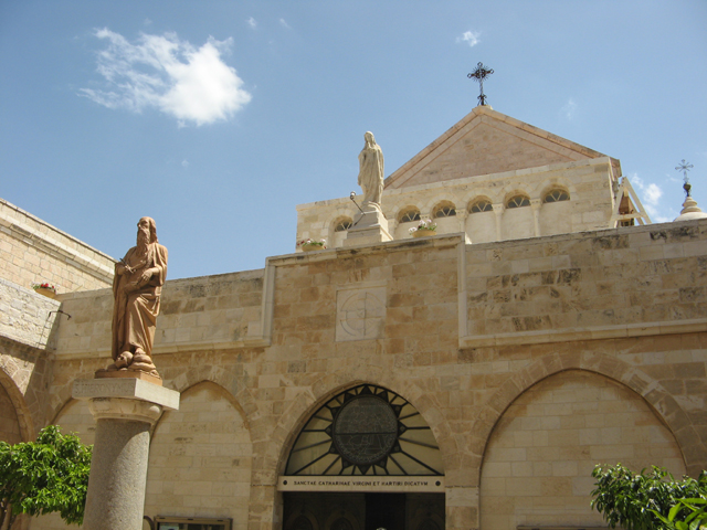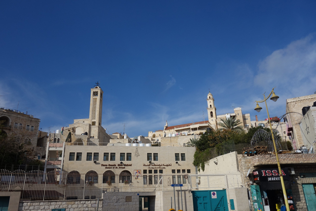 儘管停車場鄰近的房屋有明顯的老舊與髒亂,當往教堂方向行著,可能因有觀光收入的投注,嶄新的建築多了些,街景也在「馬槽廣場」轉為開闊,西面遙遙可見城裡唯一清真寺「Mosque of Omar」的喚拜塔,南側則有斑駁高牆將我們引至廣場東末的「主誕堂」。由於落入伊斯蘭手裡多年,以色列幾乎沒什麼古教堂留存,「主誕堂」是很難得的一座。經學者考據,羅馬為了淡去耶穌的影響,曾弭平了馬槽這區,以神廟供奉有著俊美容顏的植物神「阿多尼斯」,直到「君士坦丁」的母親「海倫娜」親身尋覓,才跟「拿薩勒」的聖母領報一樣,能有顯明教堂幫忙記印重要歷史的發生處。