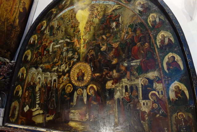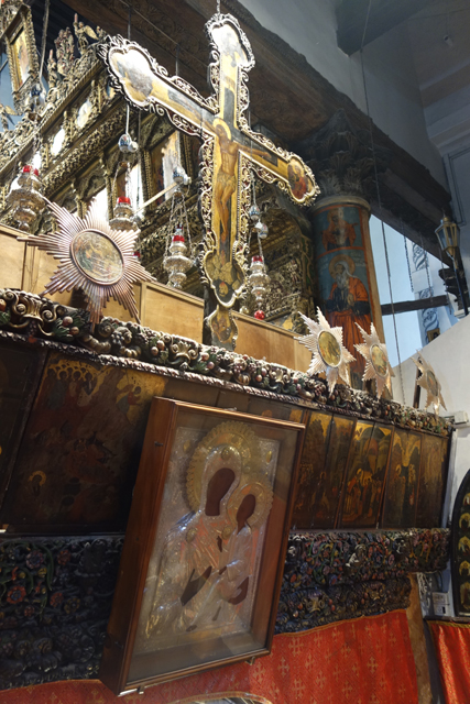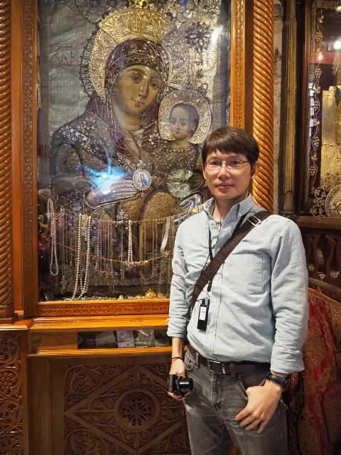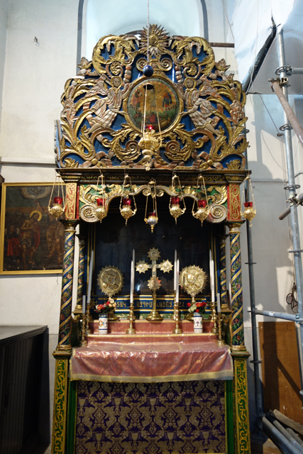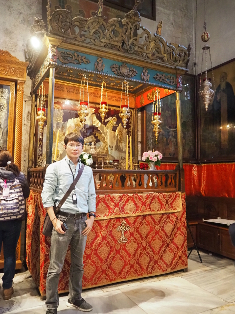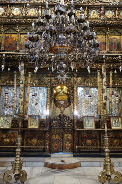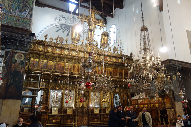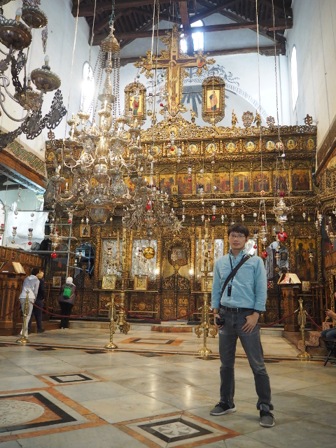 待了一陣,我們從另側的階梯離開,來到一直只能遠望的主祭壇,聽說教堂的產權相當複雜,目前東正教是這兒的老大,也擁有十四芒星那處,馬槽祭壇則歸天主教,再外加亞美尼亞,教堂的維修就是因為各派都有自我想法,才拖到前幾年才得以動工,至於主祭壇,很顯然是東正教所掌管,有著他們的特色聖像屏。整個屏板雕鏤得相當精緻,細微到可能要越過欄繩才能辨清花藤間是否真隱著鳥獸,除此之外還有無數小天使的穿插堆疊,牽著視線由中門、左右的聖母耶穌、望向上端的基督事蹟及諸多聖者,然後是最頂十字架引落的耀明天光。