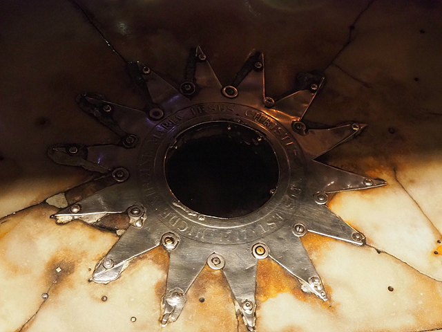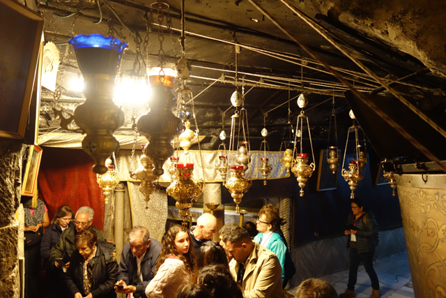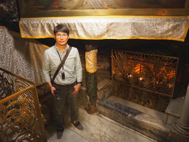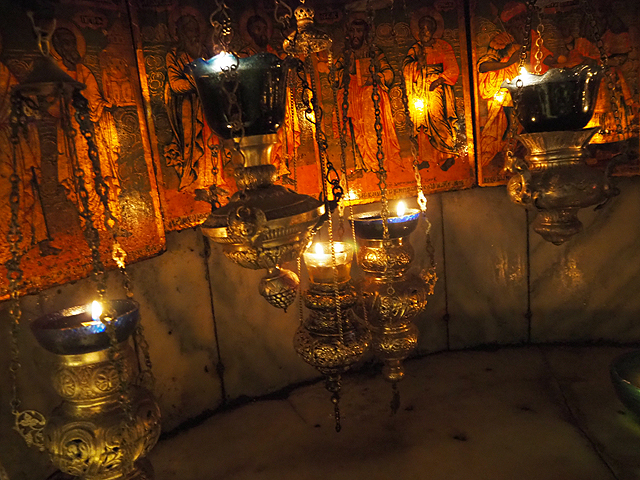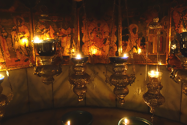 東張西望中,我好不容易排入地窟,地窟在主聖壇下,狹窄的空間裡人潮洶湧,多數都擠在正中壁爐形樣的祭壇前。祭壇上段是以金色架籬湛藍紋巾框起的拱狀龕室,下段如爐口的就是耶穌誕生的地方了。等了一會兒,我學著前人屈跪往裡望,在由不同教派供奉的掛燈圖繪下,有個銀亮的星芒釘於地上石板,星芒數目為十四,象徵「亞伯拉罕」到「大衛」,「所羅門」至迫遷巴比倫,再往後一路到耶穌剛好都是傳了十四代。雖然誕生處還在星孔之下,我也非信徒,觸著星芒心頭卻莫名悸動,畢竟是一段傳奇的起始,而我與它如此相近。