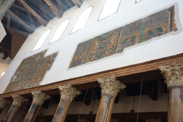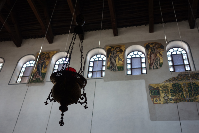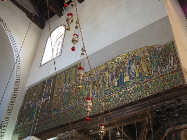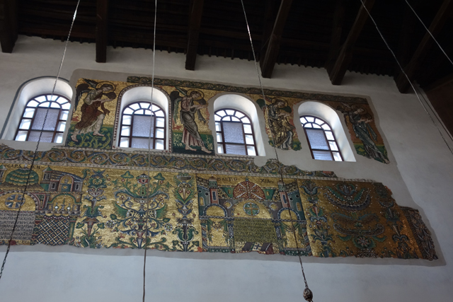 無奈在隊列罰站的我把視線拋往中廊,廊頂居然是木架結構,由貼在工事圍籬的說明板,它也的確是首要維修的項目,看來是摻了鋼條及新木去補強,再用仿古漆色作遮掩。但這樣的工法自然無法用在上段牆面,因為那兒是拜占庭時代殘留的馬賽克,與空餘處的無力刷白形成強烈對比。即便殘缺,這些經過處理的拼繪依舊爍亮得令人無法移目,靠近祭壇有些人物繁多的敘事主題,窗旁為於金色碎磚接迎的天使,下段則似不同教堂的門面,無從知曉它們的各自名號,感覺都攜著那時代的流行元素,巨碩的帽冠、立面的連串勾弧,在周邊盆栽花藤的襯飾下,顯得無比絢麗。