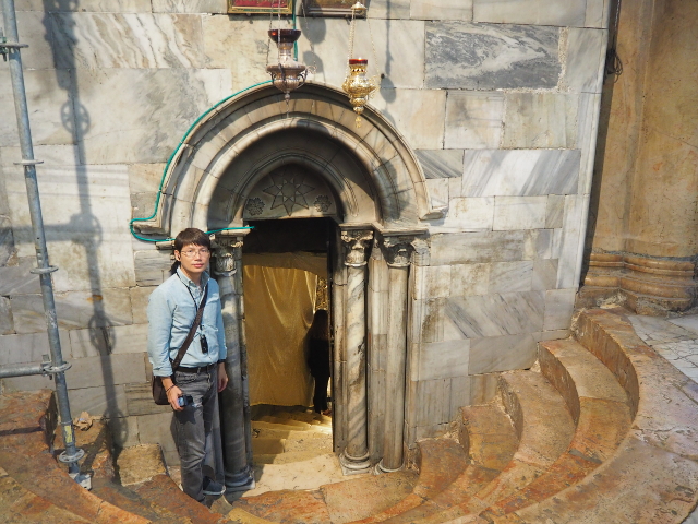 最初的教堂在「撒瑪利亞人」抗爭引發的火劫後,於「查士丁尼大帝」年間重生,很多教堂沒逃過的波斯人入侵,它很幸運避過了,據說是因為裡頭「東方三賢者來朝」的壁畫中有著波斯服飾。不過現在的輪廓感覺多為十字軍時代的修築,沒什麼具有設計感的線條交錯或流弧躍動,頂多就是跟背景幾乎融為一體的樸素山牆,若非導遊領著直去,可能會以為是普通的防禦城壘。很多文章也有提到大門的更動,被填實的長方門框內的較小拱邊,據說就是當時縮減後的尺寸,為了防止異教攻打的直接衝鋒,而面對更殘暴的「馬穆魯克」,門又被改得更小了,在我眼前的它,必須彎腰穿過,像是種進入聖地的謙卑。