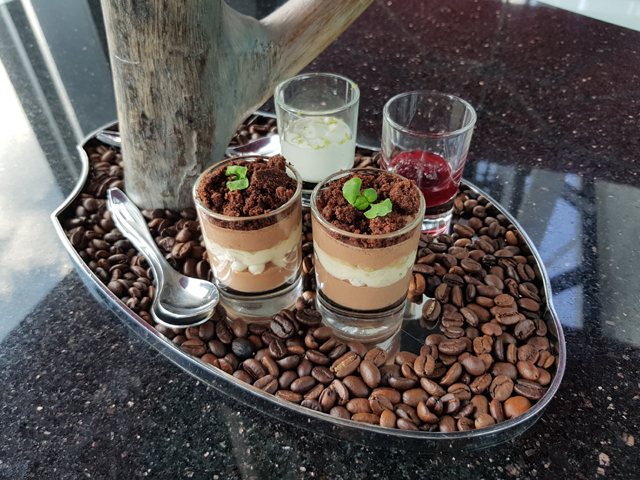 中層兩側墊著斑蘭葉的是「特製磅蛋糕」,留下的印象有點薄弱。