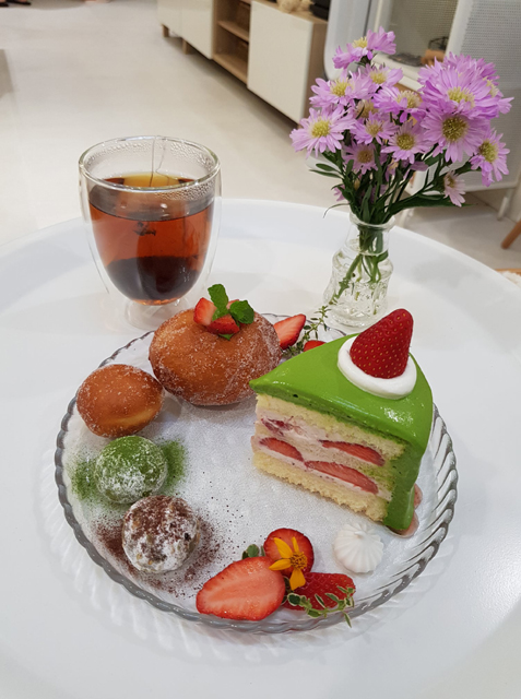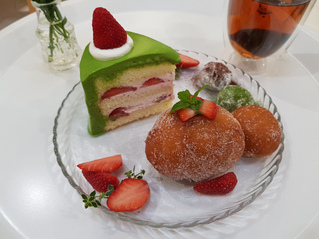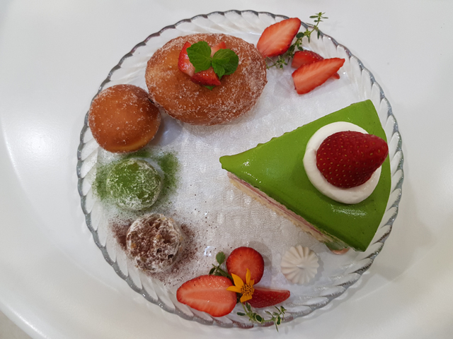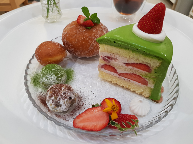 等了一陣套餐上桌囉,主角是「抹茶鮮奶油草莓戚風蛋糕」,