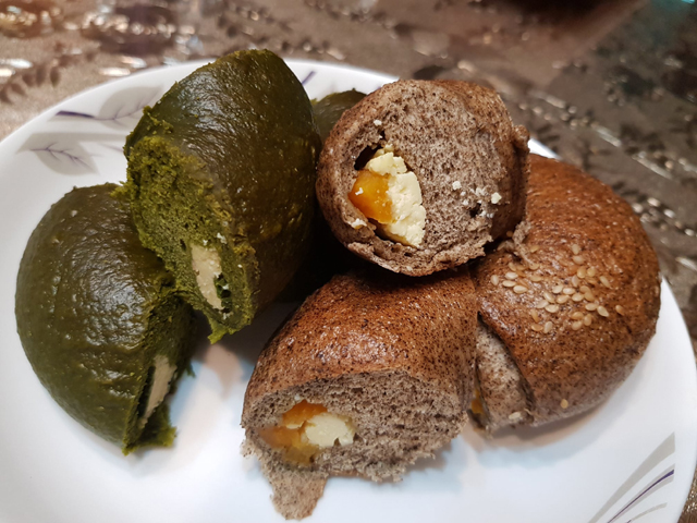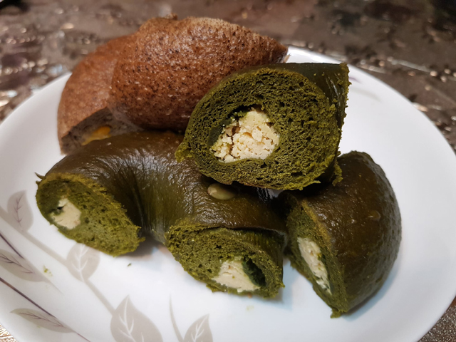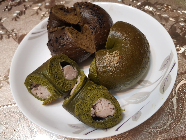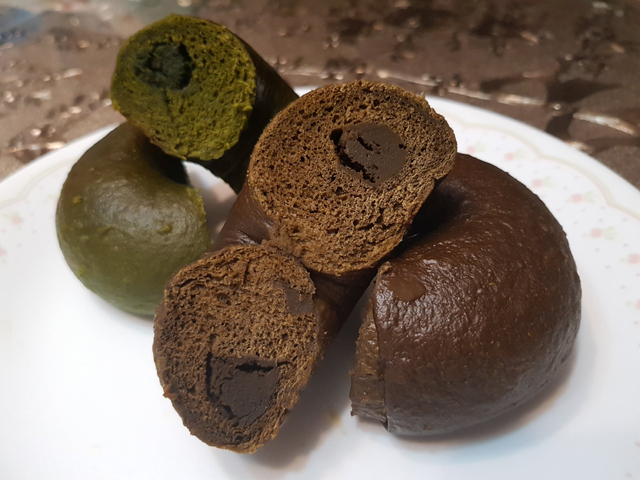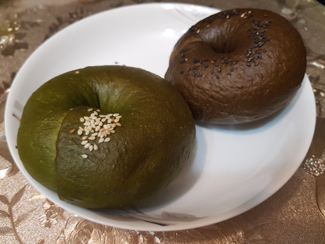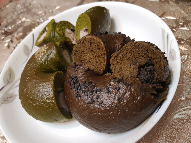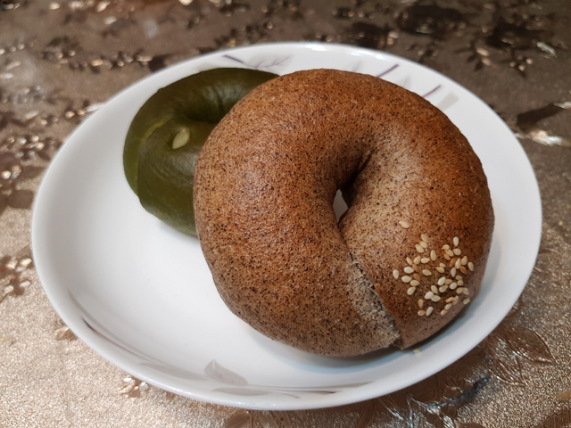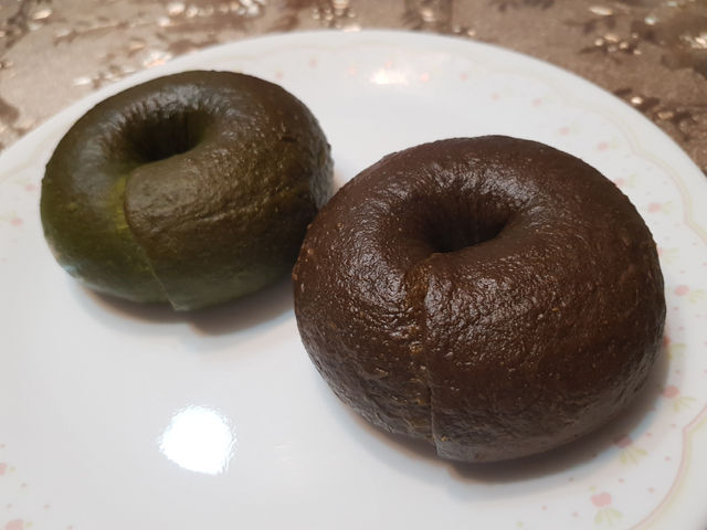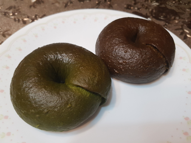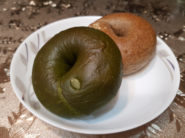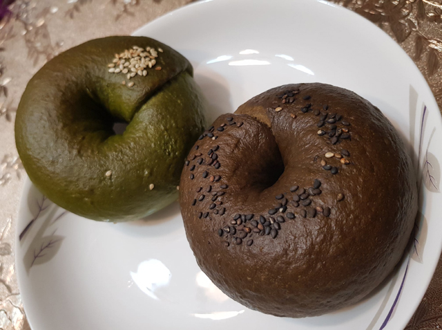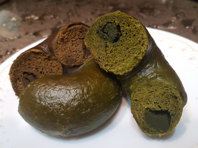 剛蒸出來的貝果表皮Q彈,內裡鬆軟,口感很不錯,抹茶的味道則是偏苦的。