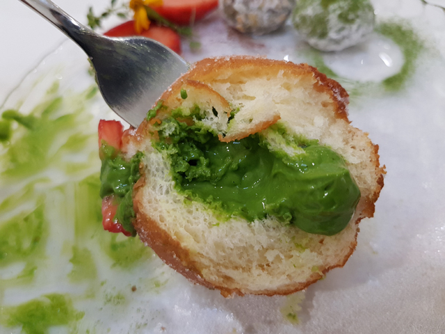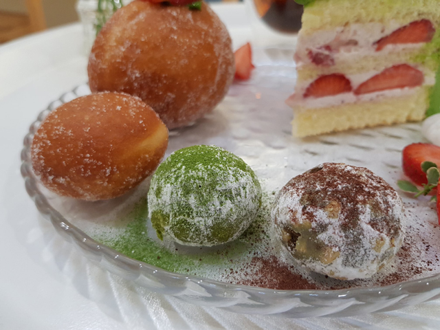 以配角身分出場的「Berliner 甜甜圈」比較像經過油炸的泡芙或包子,內餡可選擇抹茶或焙茶,