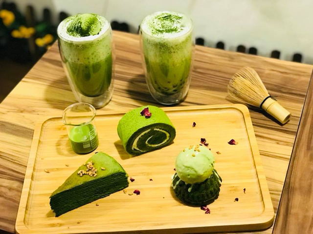 包含兩杯抹茶飲料、抹茶千層、抹茶蛋糕卷、抹茶冰淇淋磅蛋糕,圖片相當誘人。