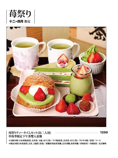 用英式下午茶架疊起「抹茶泡芙」、「抹茶霜淇淋」、「抹茶草莓奶酪」、
