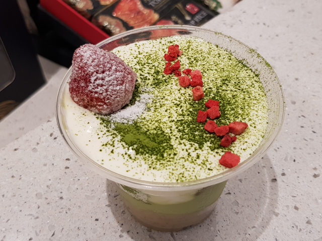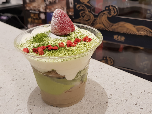 咖啡色底部為焙茶馬斯卡邦起司搭配手指餅乾,