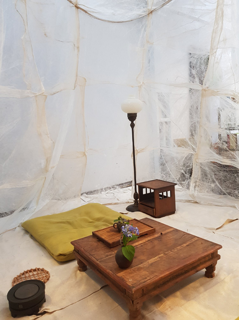坐在裡頭真的有種奇妙感覺,蠶絲透了些光,又隨微風有呼吸般的飄動,