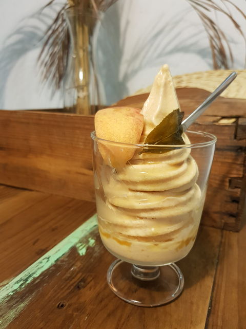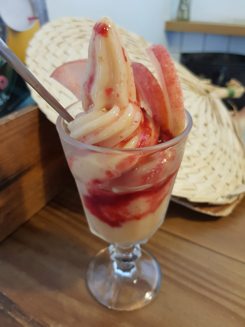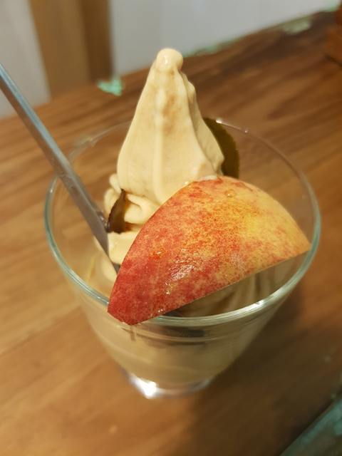這杯「梨山水蜜桃霜淇淋」可能也是為了顯味,文案說有摻入帶酸度的日本蜜李,