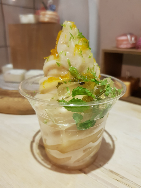 這個是「地中海高梨雪酪」,顏色這麼深是因為在海鹽、青檸、薄荷之外,
