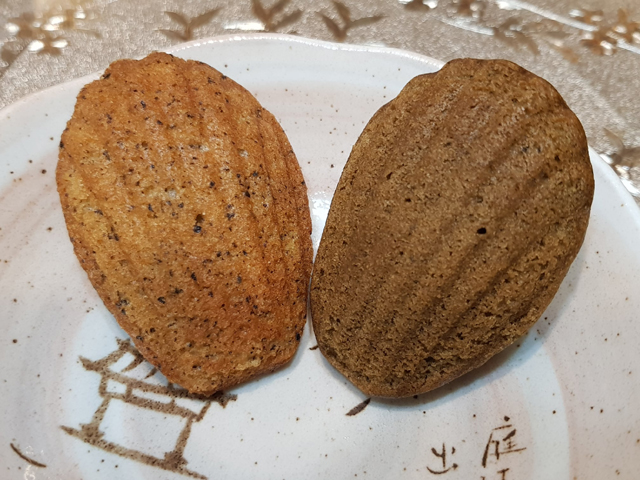 店家沒特別推薦瑪德蓮要回烤,但剩下這兩個由於是比較常見的伯爵茶(左)跟焙茶(右),