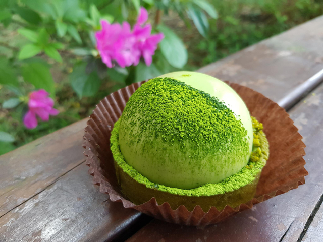 圓圓塔上面膨起部分的細緻像是抹茶慕斯,但又多了點Q彈,不知道是怎麼做的,