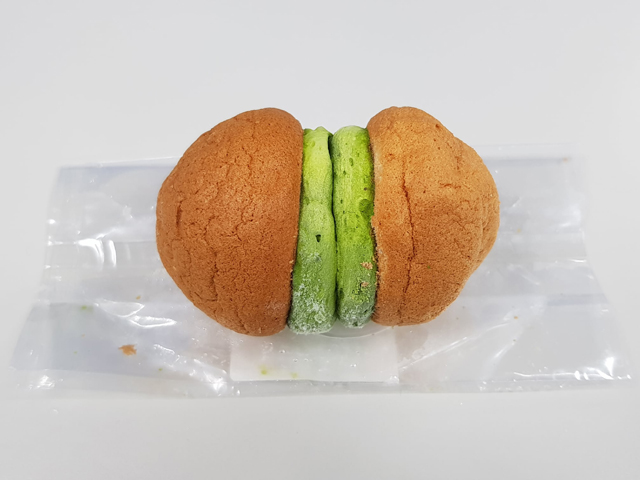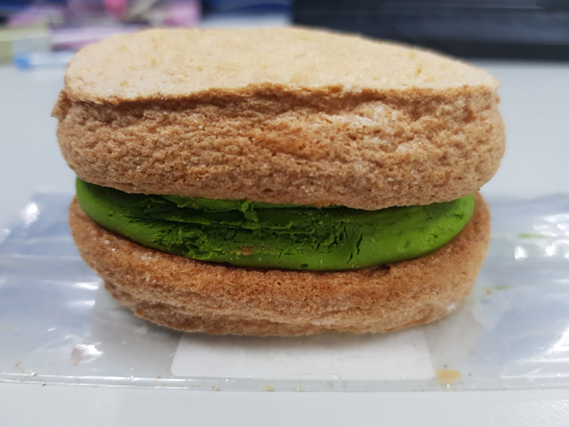 必須先解決的是「抹茶冰淇淋馬卡龍」,但打開包裝,發現吃也不是件容易事,嘴巴哪有那麼大啊,