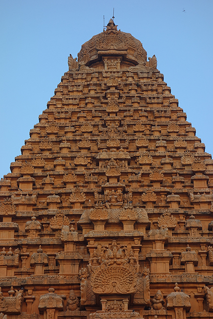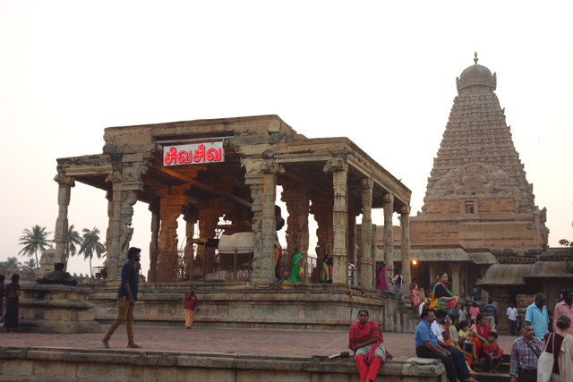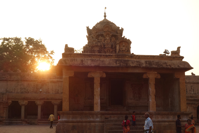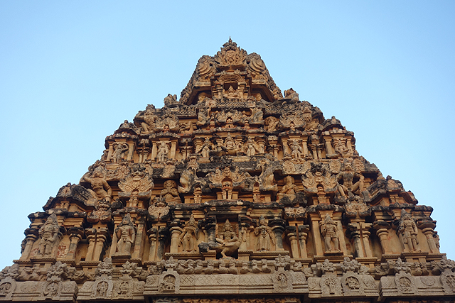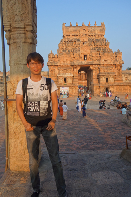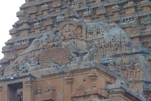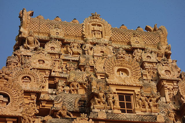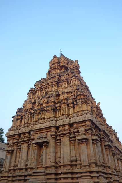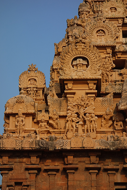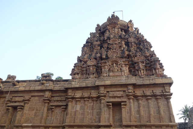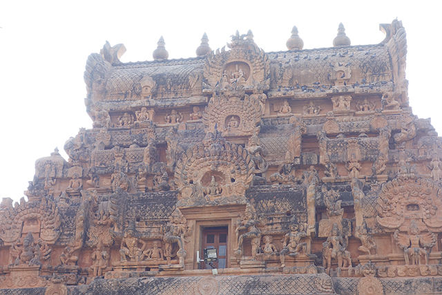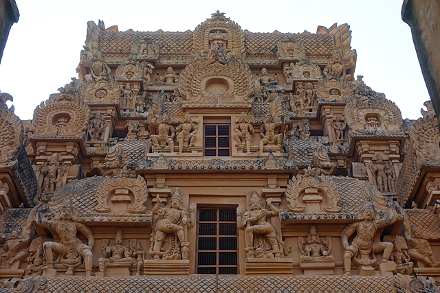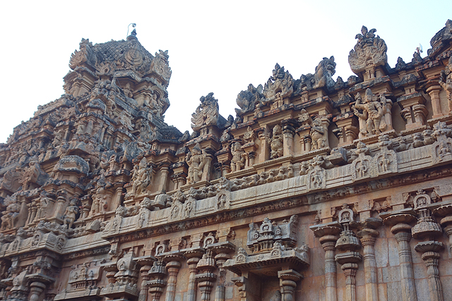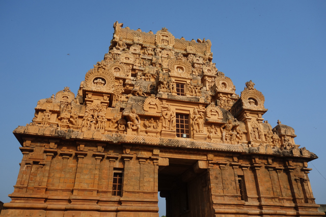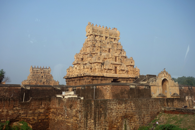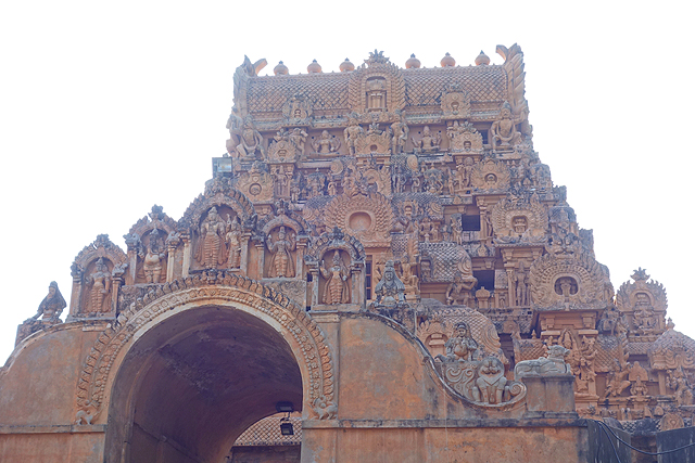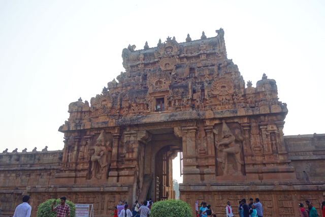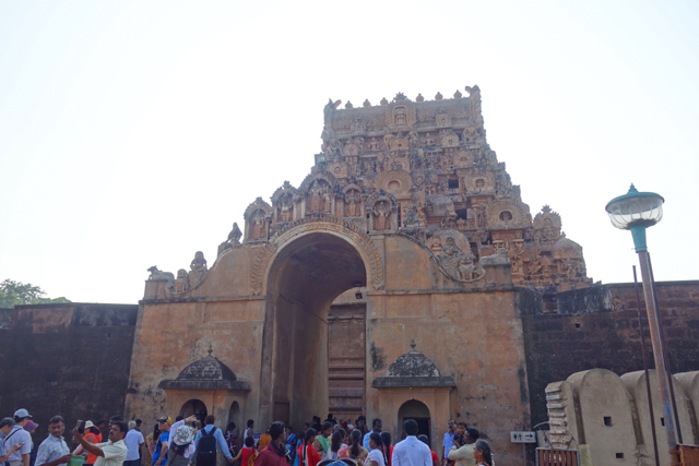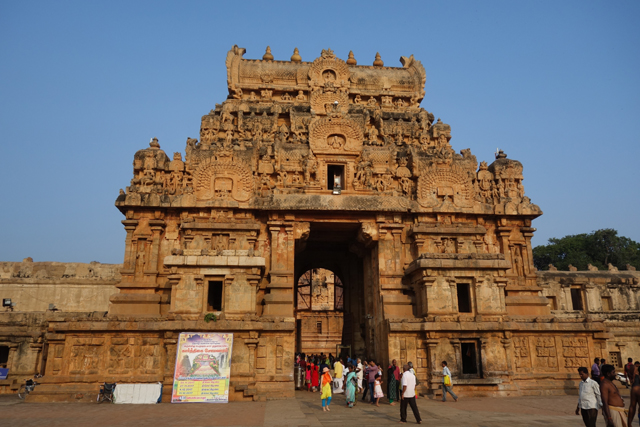 很多顯赫的王朝經過千年,多半只餘幾許石礎、或些零散的雕刻藝品,史冊上的敘述僅能各自揣想,它有幸仍有完整的建物存留,最壯闊的便是我們正驅車前往的「布哈迪斯瓦拉神廟」(Brihadisvara Temple)。中午在街頭轉繞時,曾匆匆一瞥,這回終能與其正面相對。下了車、越過乾涸的護城河,一彎拱門於城牆間勾出燄蛇般的綴邊,以神像守護。在其背後,是相對高聳的外塔門「Keralantakan tiruvasl」。那個年代「朱羅」、「哲羅」(Chera)、「潘地亞」三方勢力互有起落,這塔門便是為紀念打敗以「喀拉拉」為根據地的「哲羅」而建。