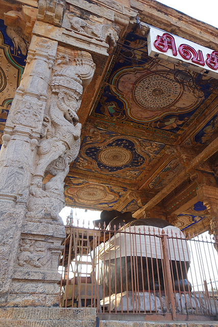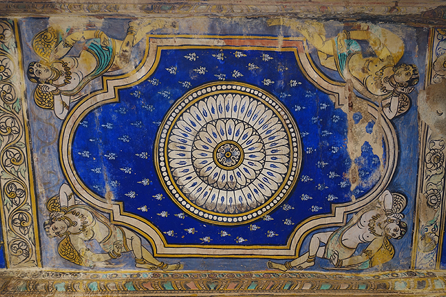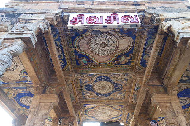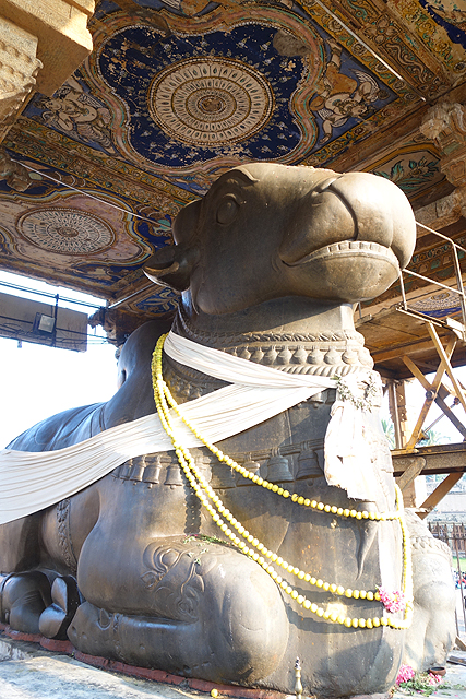 或許是為了表現自己的學養與盡責,導遊連講帶比,有種可以講到深夜之勢,這令我有點不耐,並非不愛了解建築背後的因由,而是太陽逐漸西落,我又是在和時間賽跑啊。好不容易他下台一鞠躬,我爬上「南迪」祭殿走走看看,旅程的最初曾在「邁索爾」見過號稱印度最大的「南迪」,這隻也不遑多讓,他四肢屈跪、被信徒們掛上纏巾花串,遙望著前方主人的殿堂,從正面視角,巨大的頭顱有些忠誠憨直的可愛。抬頭看向天花板,上頭斑剝的彩繪跟這幾天見過的都不太一樣,雖也仿著繁花開綻,勾邊方式卻不同,襯底的色彩則像星空。會是「朱羅」時代的風格嗎?我不禁這樣想,可是千年過去,不可能有那麼鮮亮的藍,那會是晚期的添加嗎?我盯著花團旁的帶翼天使與鷹鳥,感覺跟上一站的王宮會議廳裝飾有點像。