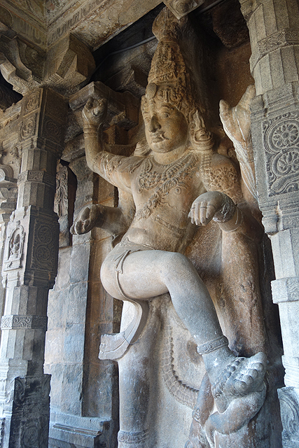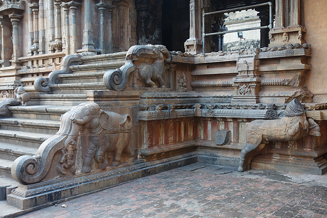 一路轉至殿側,看了片刻人像的簇密列飾,發覺入口的階梯頗具巧思,乍看為波曲狀邊欄,其實上段是威猛異獸,牠反首張嘴,利牙間長舌如蛇。下段為小象的長鼻延伸,搭配小胖人一個舞劍騎乘、另個被捲勾倒懸。一旁還有隻殘缺戰馬,馬後空置的部份本該有著車輪,是將殿閣仿作戰車,朝旭日奔馳的概念。記得我在請人幫拍之後,有抓著時間進殿轉了一趟,但在不能拍照的困境下,望過的自然皆成煙塵,就連網路所提,前段是「坦賈武爾馬拉塔」補建的多柱廳,有諸王肖像,也沒半點印象留存,只能由廳外的廊柱去想像。