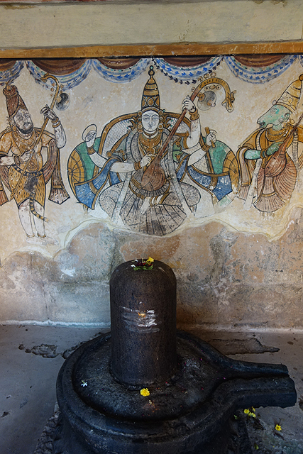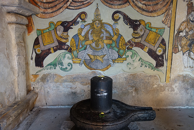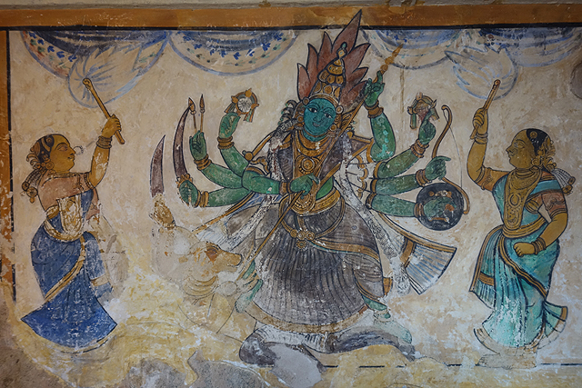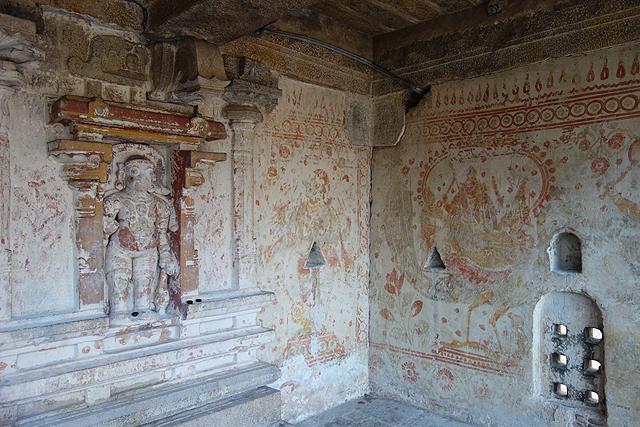 走進小殿,廳裡只有壁龕還留存祭奉過的痕跡,斷鼻也令象神略失風範,壁畫褪得難以辨析主題,僅能由朱紅顏彩揣想當年的滿室繁花。相形之下,環繞廣場的廊牆圖繪就清晰得多,可以找到毗濕奴的妻子「吉祥天」(Lakshmi),她在大象的護守下,形構為「Gajalakshmi」。自然也有許多關於濕婆的,多才多藝的他彈琴、揚舞,襯上各種極富個性的故事,難怪奉祭他的廟宇似乎比梵天與毗濕奴還要多。